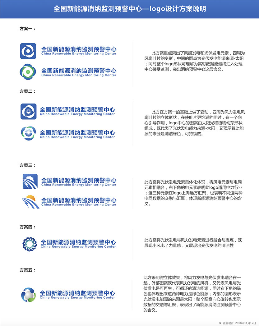 制約新能源消納的關(guān)鍵因素,為新能源的優(yōu)化布局和行業(yè)政策制定提供參考,促進我國新能源高質(zhì)量發(fā)展。 藍藍設(shè)計對全國新能源消納監(jiān)測預(yù)警中心的工作范圍做了調(diào)查研究,首先理解業(yè)務(wù)和核心競爭力,之后調(diào)查了行業(yè)相關(guān)品牌標志設(shè)計,聽取了大家的期望,之后設(shè)計出多版logo供選擇。標志設(shè)計確定后進行了VI和宣傳冊的設(shè)計。