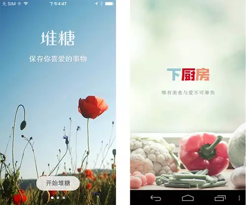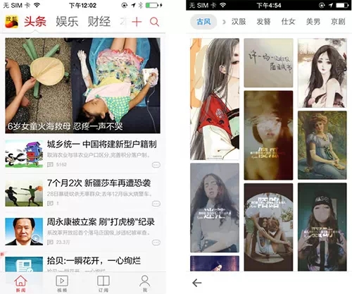下面的左圖是一個(gè)新聞app,采用豎向分欄的布局,模塊化的結(jié)構(gòu)使得信息的展現(xiàn)整潔和嚴(yán)謹(jǐn)。右圖是一個(gè)圖片展示app,則采用了三欄的布局,把圖片以這種瀑布流的形式展現(xiàn)給用戶,方便用戶快速瀏覽。但是由于平級(jí)的信息,很難區(qū)分主次,而人的視線很難在同一時(shí)間聚焦在兩個(gè)或者兩個(gè)以上的事物上,所以通過(guò)圖片錯(cuò)路排列,使得畫面更為活潑。