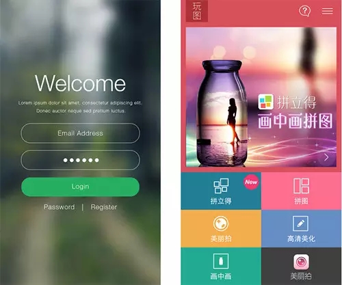 下面的左圖是一個(gè)注冊(cè)頁(yè)面,btn采用了中軸型的構(gòu)圖,清晰地展現(xiàn)了操作項(xiàng)和注冊(cè)流程。右圖采用了上下分割的版面構(gòu)成,上面為圖片展示,下面部分為選項(xiàng)和操作,結(jié)構(gòu)非常清晰。
