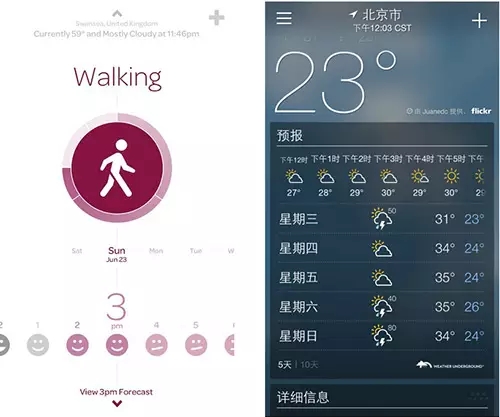 下面的兩個(gè)圖例雖然都以信息的展示為主,但因界面的信息量、app的功能特性因素的影響,左圖的運(yùn)動(dòng)記錄界面信息量比較上,采用了中軸型布局,而右圖的天氣app信息量比較大,采用了滿版型布局。合理的布局選擇對(duì)于信息的展示有至關(guān)重要的作用。