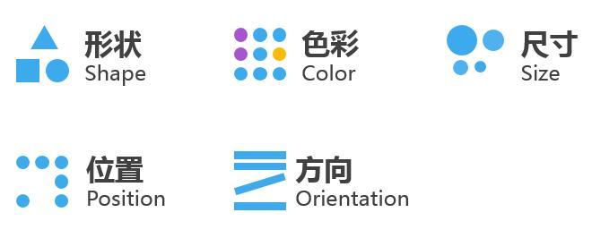 • 將這些數值轉換成視覺結構(包括形狀、位置、尺寸、值、方向、色彩、紋理等),通過視覺的方式把它表現出來。例如將高中低的風險轉換成紅黃藍等色彩,數值轉換成大小。