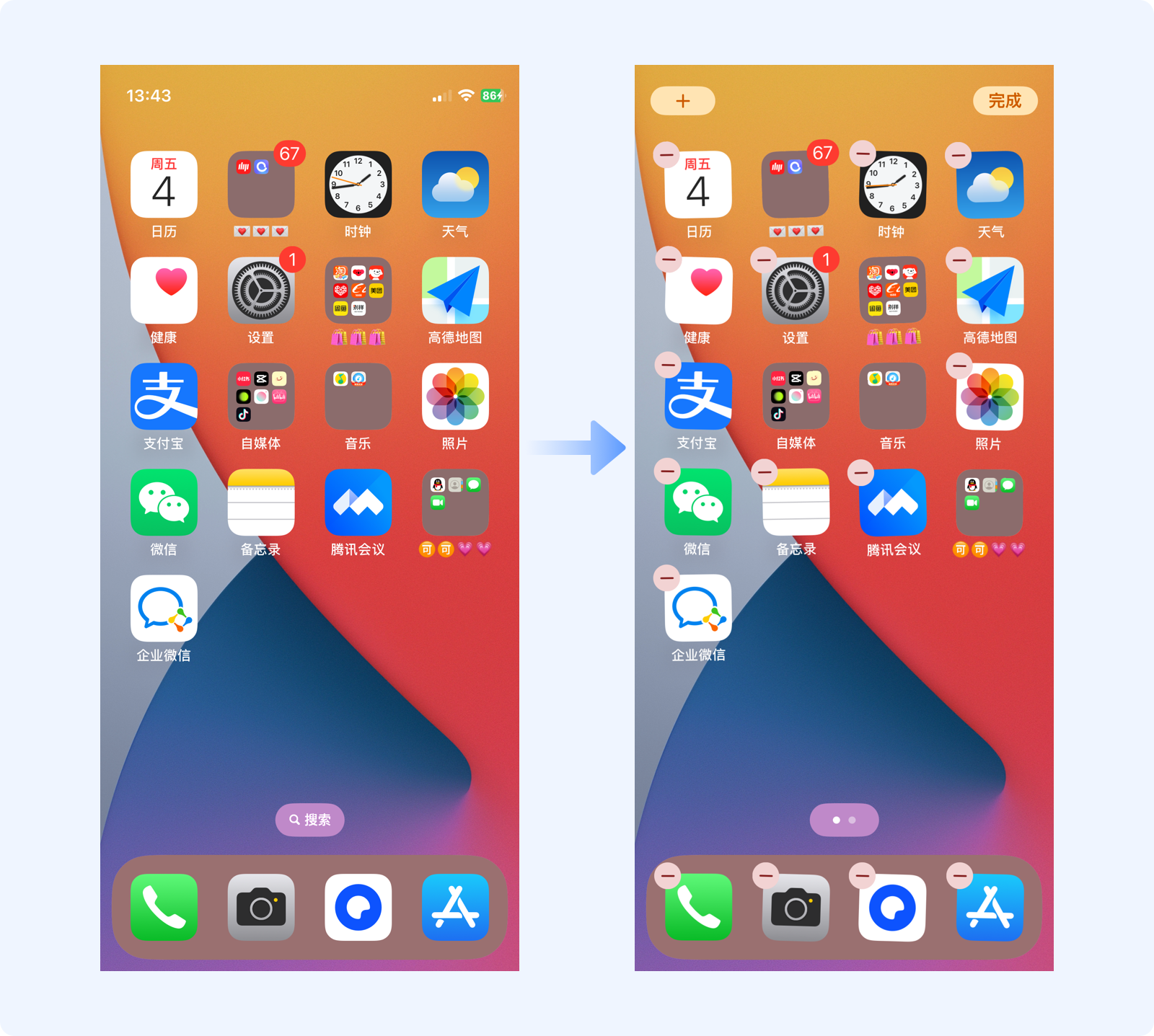 移動(dòng)端產(chǎn)品中有很多這樣的案例,如iOS系統(tǒng)中,長按刪除某個(gè)APP時(shí),所有桌面圖標(biāo)會(huì)抖動(dòng)、且左上角都有一個(gè)相同的刪除圖標(biāo),通過一致性的動(dòng)作告知用戶圖標(biāo)的可操作狀態(tài),非常直觀。