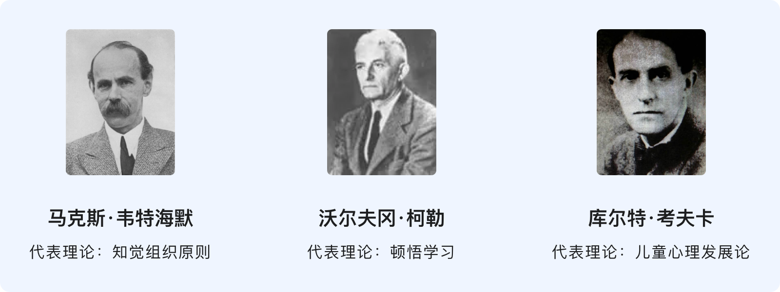 格式塔的德文為“Gestalt”,意思為「形狀」和「圖形」,在心理學(xué)中可以看作是任何一種被分離的整體。格式塔心理學(xué)的研究源于視知覺,是現(xiàn)代認(rèn)知主義學(xué)習(xí)理論的先驅(qū),為后來的社會(huì)心理學(xué)的發(fā)展打下了堅(jiān)實(shí)的基礎(chǔ),其創(chuàng)始人是韋特海墨、考夫卡和苛勒。