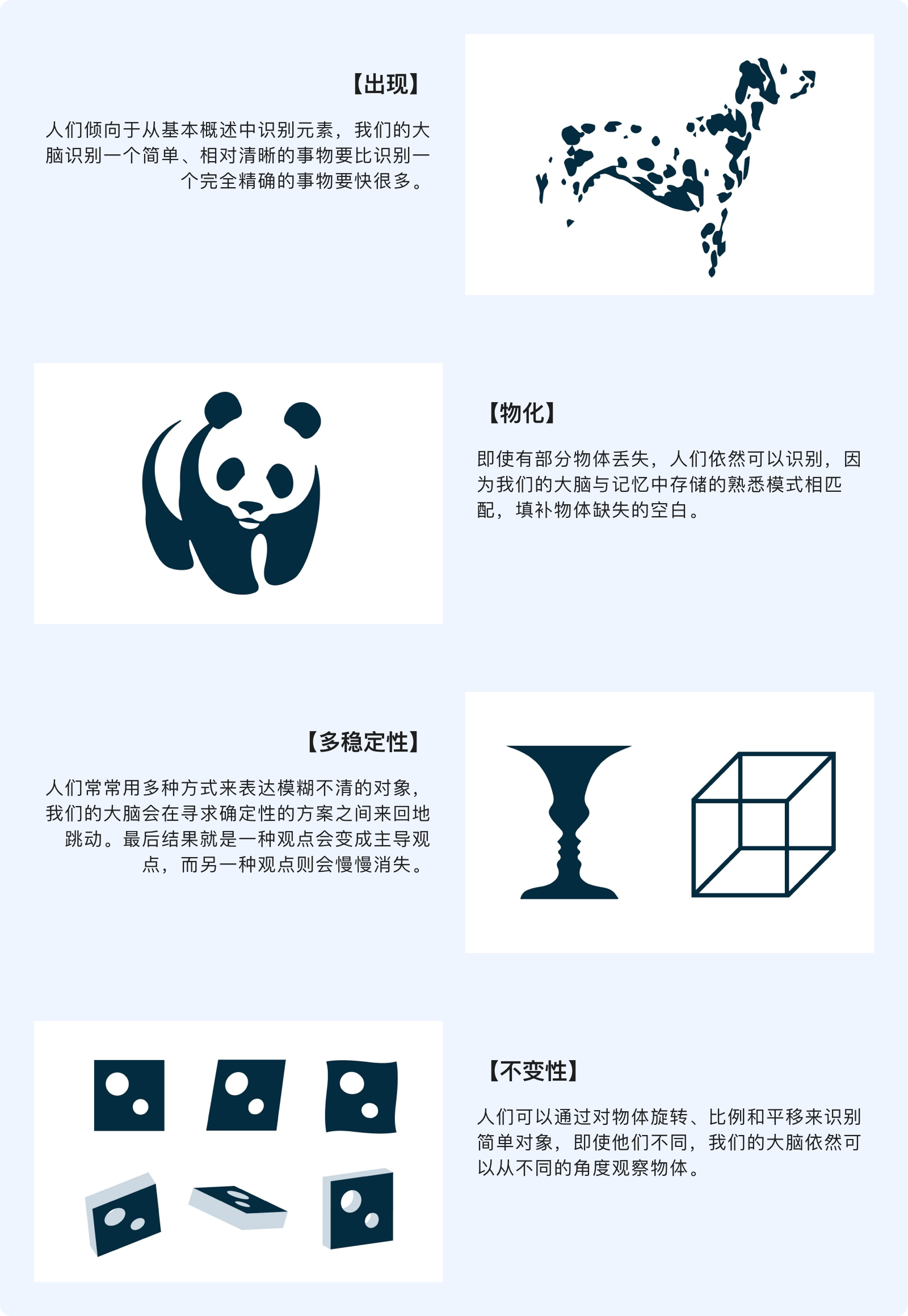格式塔原理試圖解釋人們?cè)诤线m的情況下如何看待視覺元素。這些建立在四個(gè)關(guān)鍵想法上:【出現(xiàn)】、【物化】、【多穩(wěn)定性】、【不變性】。