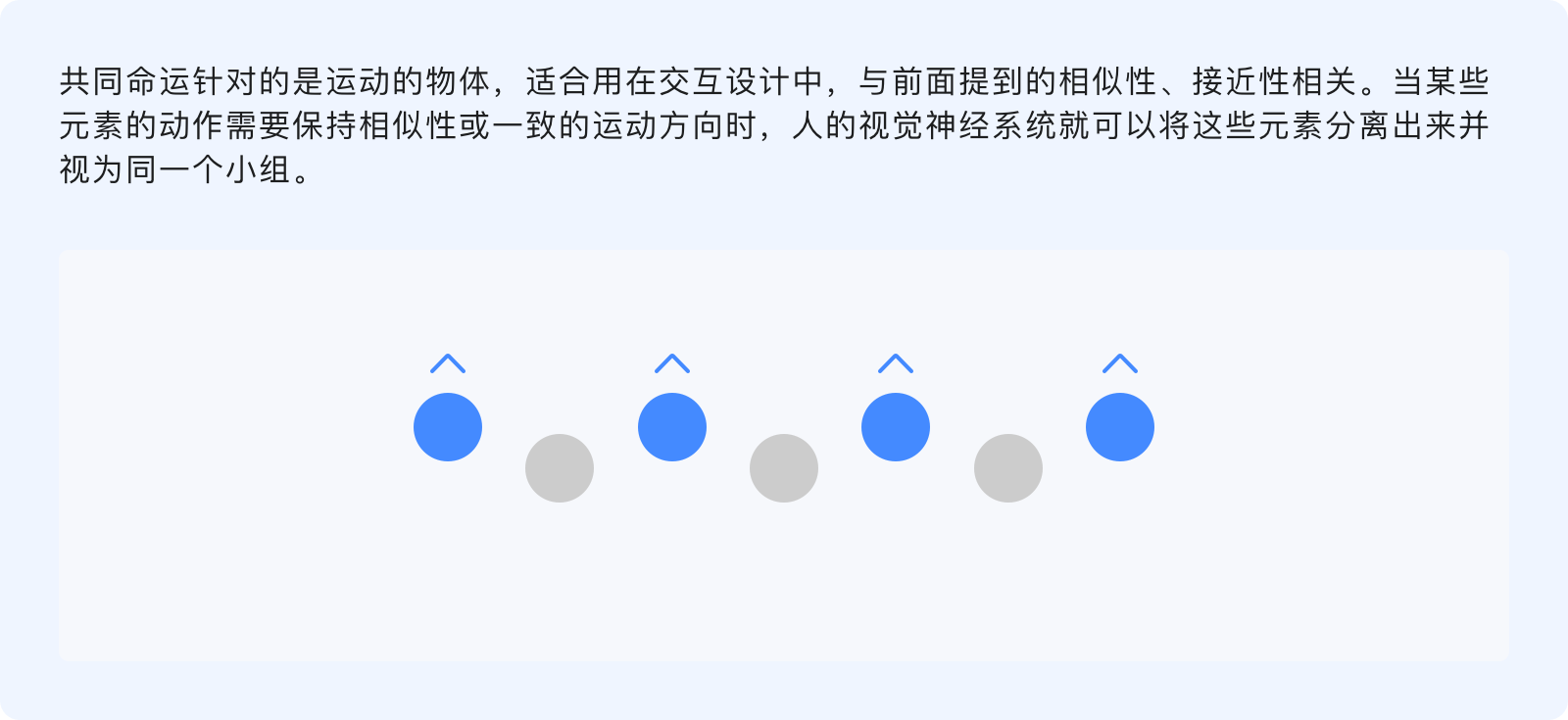 共同命運(yùn)原則指出,人們傾向于將具有共同運(yùn)動(dòng)形式的事物感知為一個(gè)彼此相關(guān)的整體,無論元素之間的距離有多遠(yuǎn)、或其他屬性(形狀、顏色、大?。└鳟?,但只要沿著相同的方向、相同的速度運(yùn)動(dòng),共同命運(yùn)就會(huì)將其歸類。