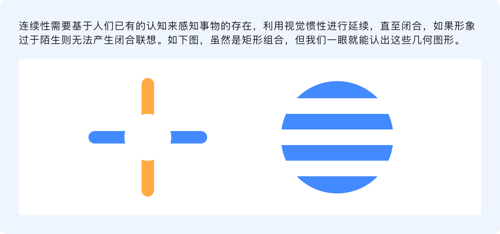 連續(xù)性原則指出,人的視覺傾向于完整的連接一個(gè)圖形,而不是零散的碎片,通過感知事物的形狀和運(yùn)動(dòng)方向?qū)⒎稚⒌脑剡B接在一起,使直線繼續(xù)成為直線、曲線繼續(xù)成為曲線并朝著特定的方向延續(xù)。