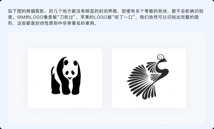 封閉性原則指出,人們的視覺系統(tǒng)傾向于將不完整的局部當(dāng)做一個(gè)整體來感知??雌饋砼c連續(xù)性有諸多相似,不過連續(xù)性是通過物體的形狀和運(yùn)動(dòng)方向、按照視覺慣性來制定閉合規(guī)律,而封閉性則并無特定規(guī)律,只要把握好不完整物體的尺度、使各元素之間相互輔助,就能讓其與我們認(rèn)知模型中的原型匹配。