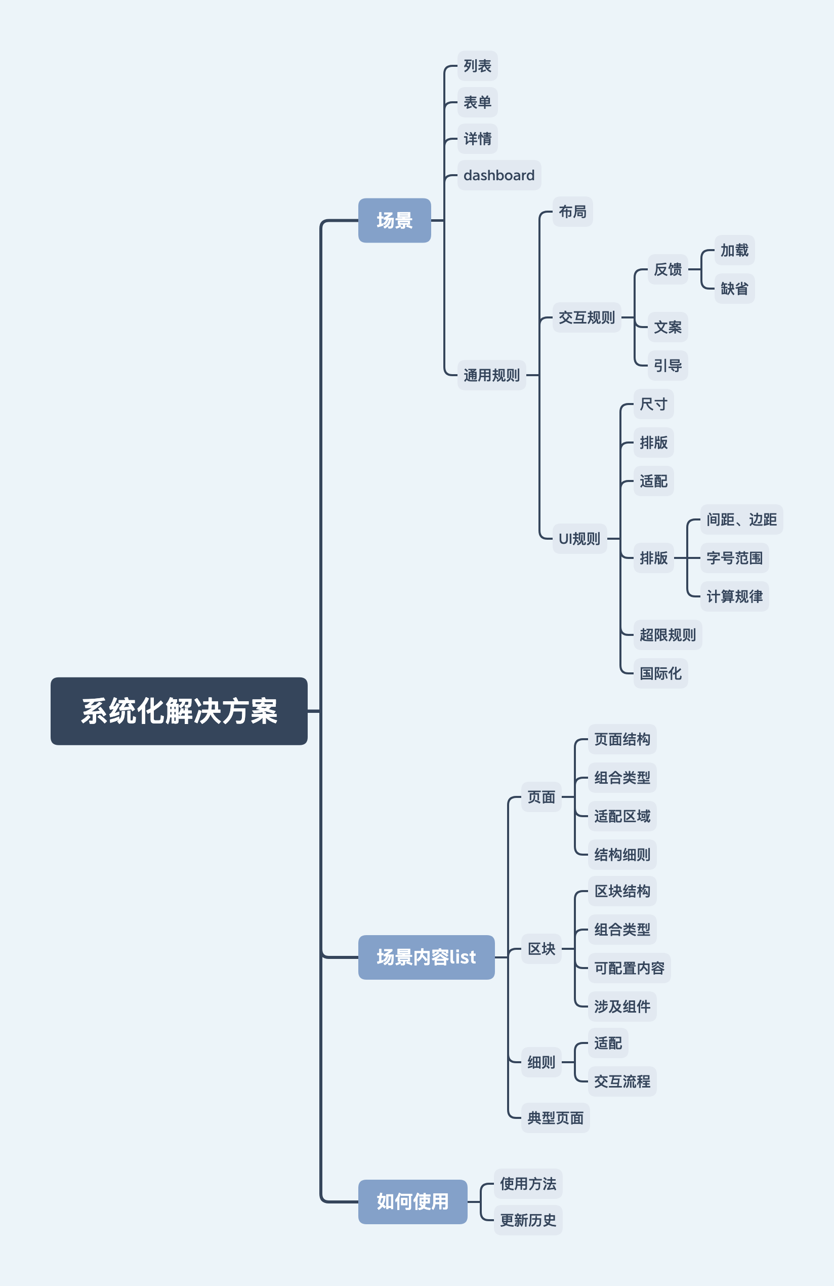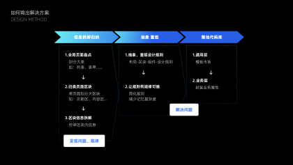 從第一步全盤的信息拆解和歸納, 已經發現問題, 這一階段主要2點:第一是如何通過設計規則來避免同樣的問題產生,第二是如何通過簡單的規則重組減少多人合作記憶復雜度。思路類似于設計一個界面,首先得有一個布局劃分,不同的區塊要放哪些內容,再到區塊里的細節內容規則,從而抽象出由布局到區塊的設計規則和可復用的組件。