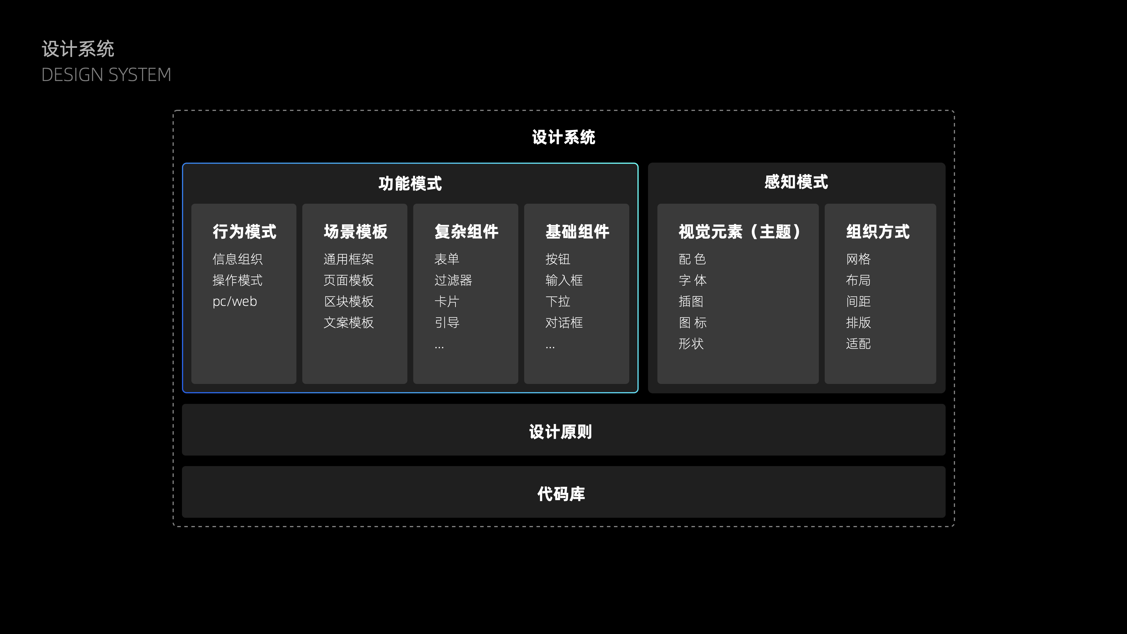 大多數日常需求大多是從單點出發,當點變多變復雜了,就容易出現上述說到的現狀問題。所以解決方案需要基于業務全盤進行設計抽象:從元素——組件——區塊——頁面——功能流程沉淀設計規則并代碼化,來靈活提供拼裝N個不同頁面的機制,幫助團隊更系統化的進行產品設計。從組成內容不難看出,解決方案是需要建立在基礎組件基礎上,與基礎組件、復雜組件、行為模式共同組成設計系統的【功能模式】部分。