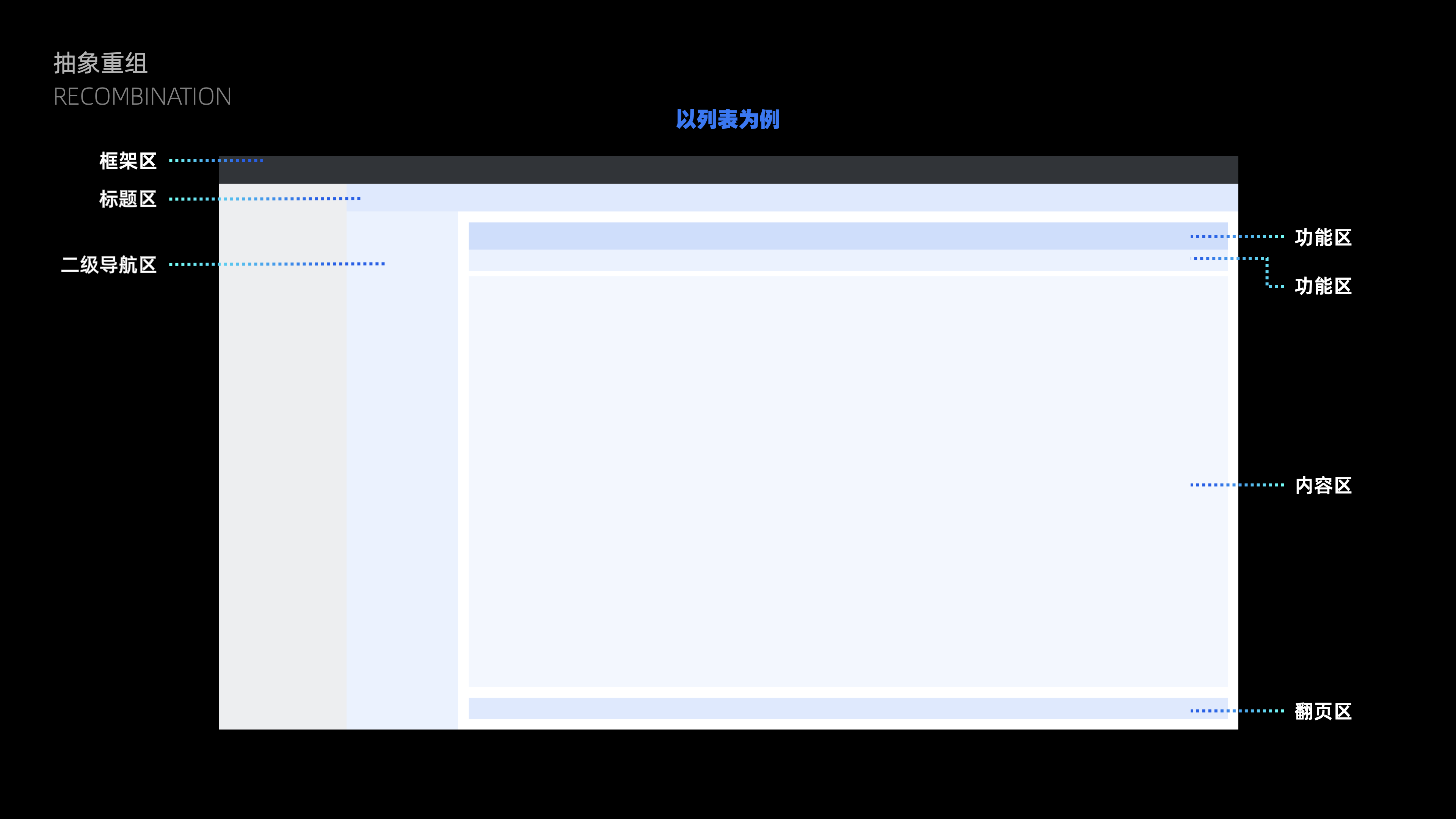2、其中列表的內容大致區塊分為:頁面標題區、列表操作、列表篩選、列表內容,到這個階段已經可以發現,相同區塊位置就存在不穩定,在后臺系統中可能影響面不會非常大,但對于內容復雜繁多的工具或C端界面就會容易出現找不到的情況。