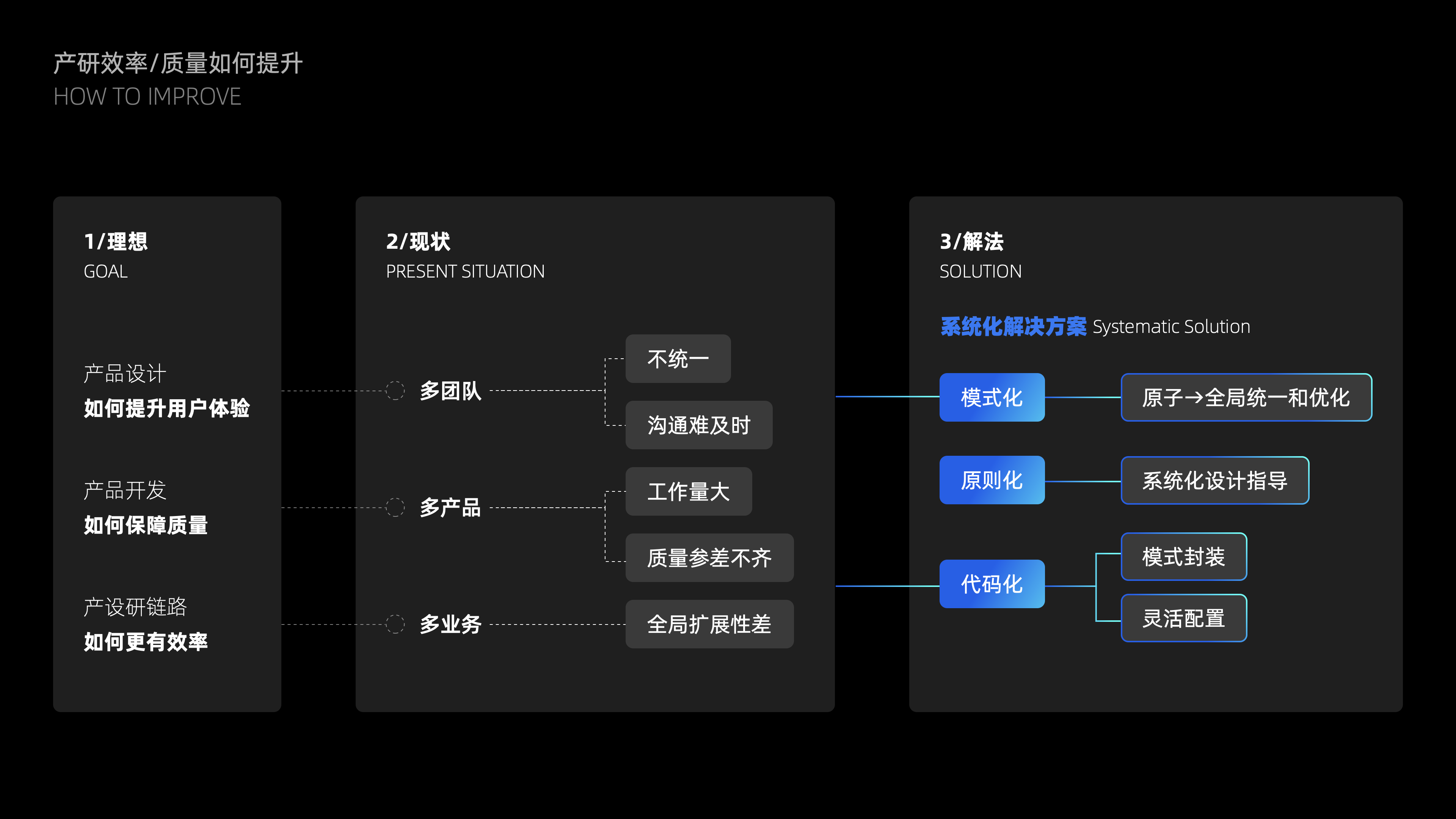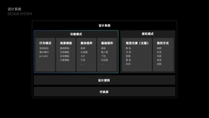 所以如何解決團隊效率和產品質量問題?我們的解法是抽象體系化的解決方案:設計模式化和代碼化,設計從原子到全局進行統一和優化,并形成系統化的設計指導,由開發進行模式代碼化,提供靈活可配置的規則。以此,設計有更系統化的設計原則,整體的統一性和體驗有保障,設計和開發周期也可以縮減,甚至大部分日常需求可直接由產品對接開發直接上線。