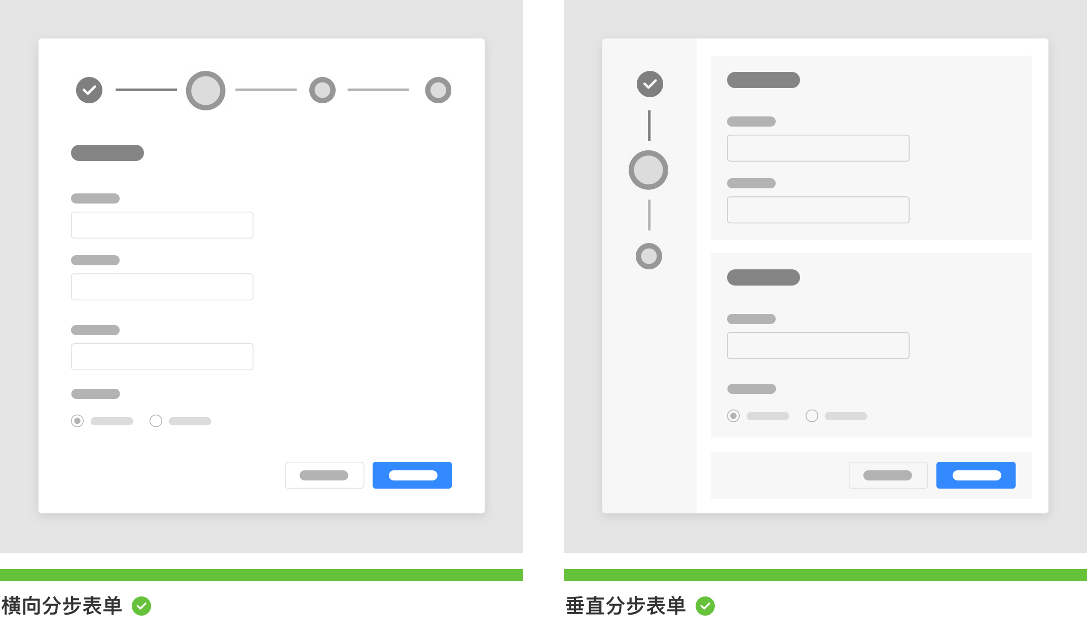 較為復雜的一類表單,把一個相對復雜的表單字段拆解為多個步驟進行。根據業務屬性進行步驟分組利用步驟條告訴用戶所完成的流程和進度,當用戶每次填寫都意味著一次節點完成,整個流程結束給予明確的結果反饋,并以提交成功為最終。分布表單有利于減輕用戶由于表單大而復雜的造成的填寫負擔,并且能減少用戶表單填寫出錯率。