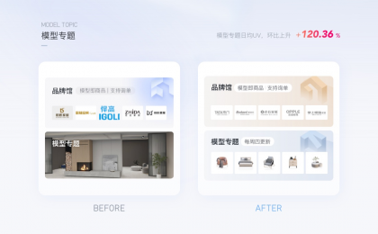 群核下的設計工具,以專題化的形式聚類商家、平臺推薦的模型是基本的運營動作,如下圖,原本以真實效果圖的方式展示模型專題,用戶難以感知是方案還是模型。通過封面圖形的優化:將核心的模型類型展示出來,用戶能夠預見里面的內容。