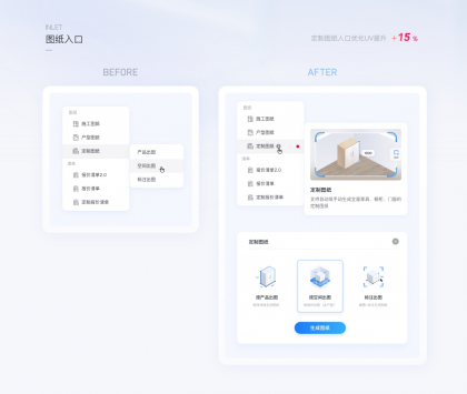 在新版優化中圖形化的表達了圖紙類型的差異,即便增加了流程步驟數,最終用戶點擊圖紙的UV提升了15%,此案例可以說明,更精準有效的對象表達能吸引更多用戶來使用此功能,對業務產生直接效果。
