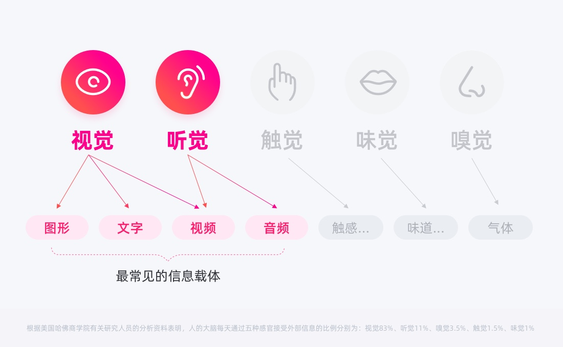 在產(chǎn)品界面中信息交互過程中,信息最為常見的四種載體:圖形、文字、音頻、視頻(全景圖、gif圖、動(dòng)效圖在大類暫時(shí)可算圖形,不作細(xì)分),而圖、文占據(jù)了絕對的比重,所以需要重點(diǎn)關(guān)注圖、文信息的識別體驗(yàn)。