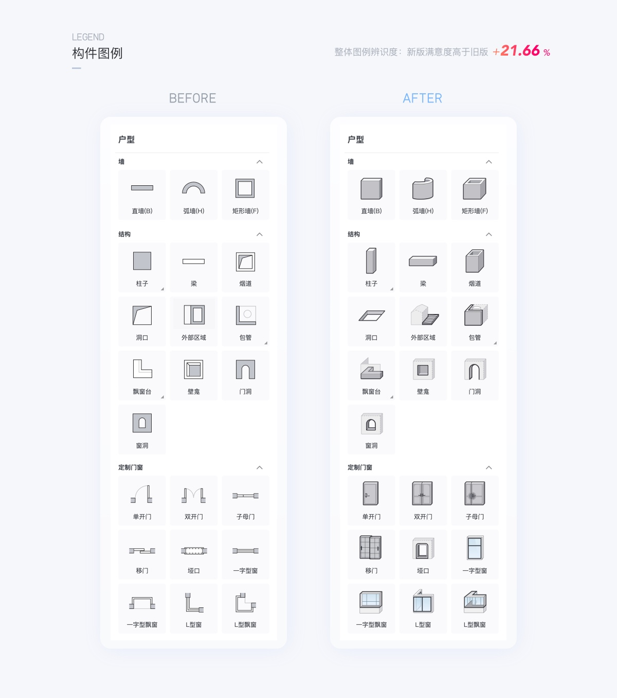 戶型繪制和調(diào)整是酷家樂工具的必經(jīng)之路,由于對象間用2D圖形圖例表達(dá)比較難辨識出來準(zhǔn)確意思,因此設(shè)計(jì)做了圖形信息的優(yōu)化,讓命令更為直觀,更高效的拾取命令操作。