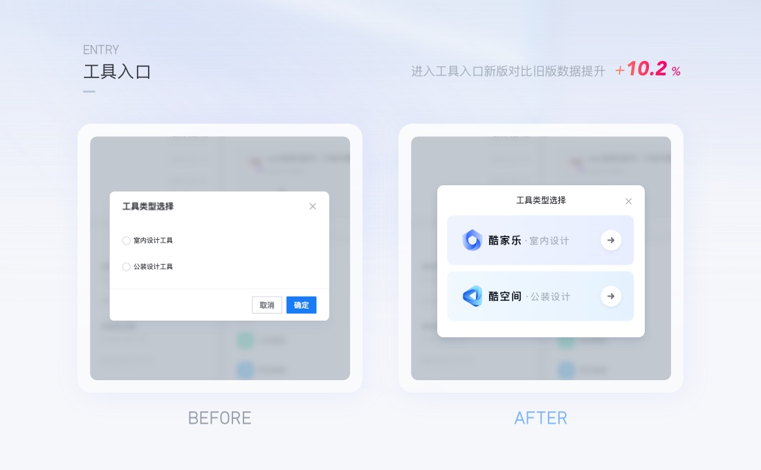 案例1:工具入口的圖形化表達(dá)用戶從工作臺進(jìn)入到設(shè)計(jì)工具,純文本的表達(dá)用戶很容易產(chǎn)生疑惑,在不改變業(yè)務(wù)邏輯的情況下,進(jìn)行圖形化表達(dá)。