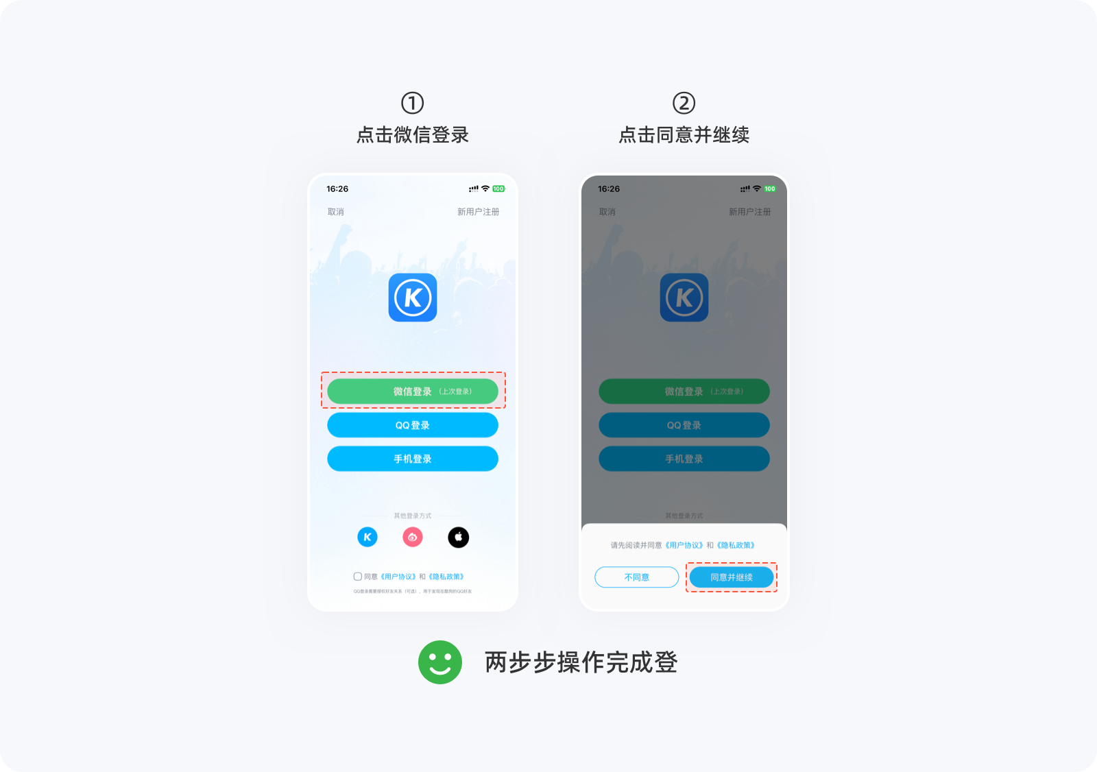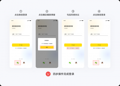 用戶在進行一個任務時,提升任務完成率最好的辦法就是避免復雜,任何一個流程,能用N次操作解決的事情,就不要用N+1次操作來完成,讓用戶以最少的點擊次數就能完成任務,以提升用戶對產品的滿意度與忠誠度。下圖是用戶登錄未勾選「用戶服務協議」,圖1、圖2分別給出了不同的交互流程,顯然,圖2的操作次數更少,讓登錄變的更容易完成。在設計一個功能時,如果存在多種交互方案,那么最簡單那個肯定是最好的。▽圖1:四步操作完成登錄
