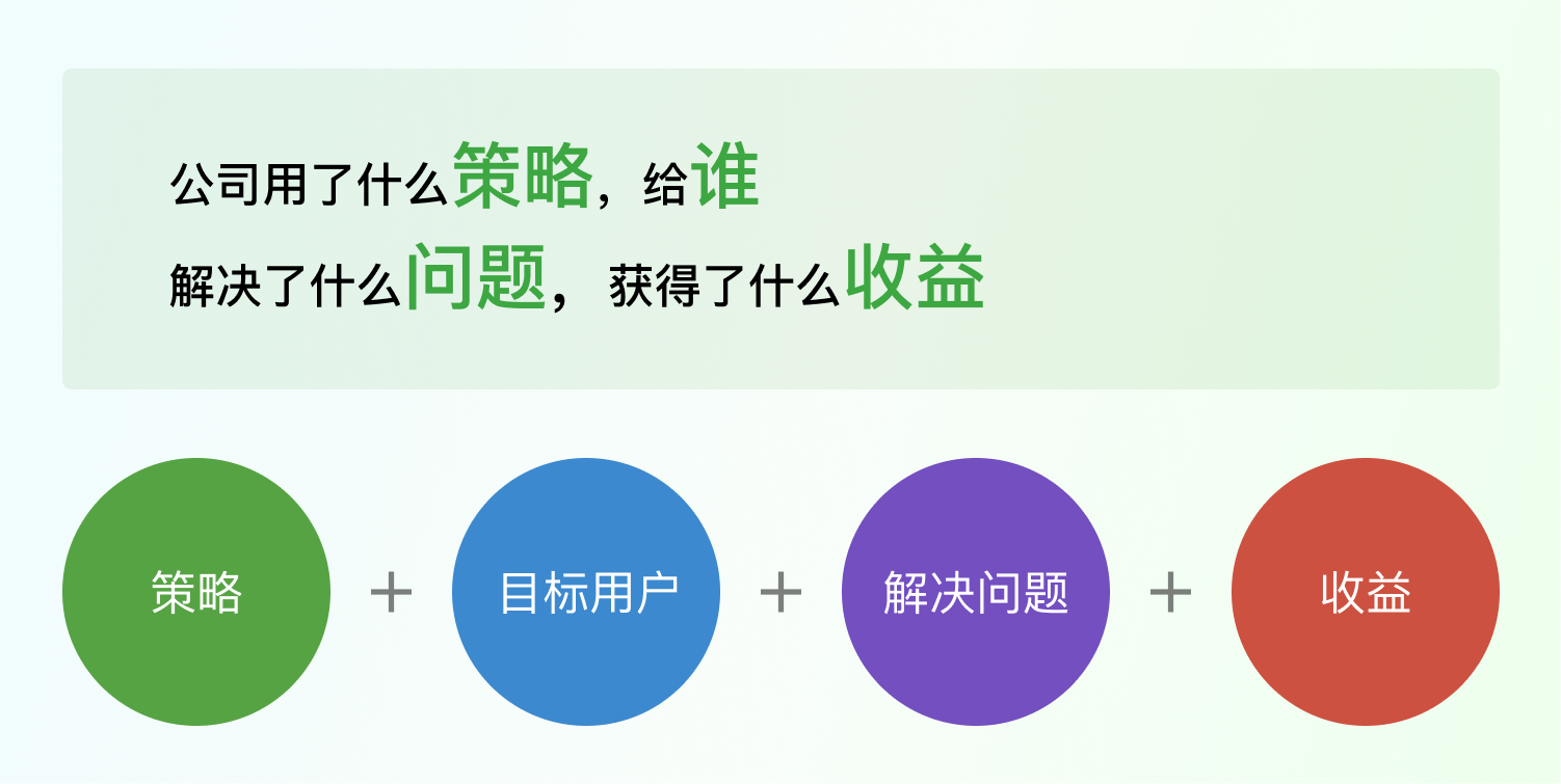 到此先做個小結:① 了解公司盈利和運作的公式:公司用了什么策略,給誰,解決了什么問題,獲得了什么收益