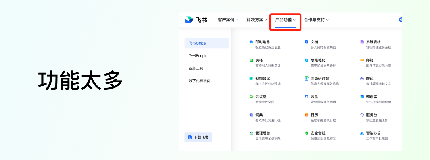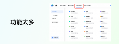 去哪里了解呢?一般企業官網都會把自家產品列出來,方便客戶查看,咱們也可以順著這條路線去走。就拿飛書舉例,從導航欄的“產品功能”我們可以看到,主要是四條線,咱們不用把每條線都挖得很細致,但是起碼要有大概的認知,知道這是個什么東西,做什么的,最好上手體驗體驗。