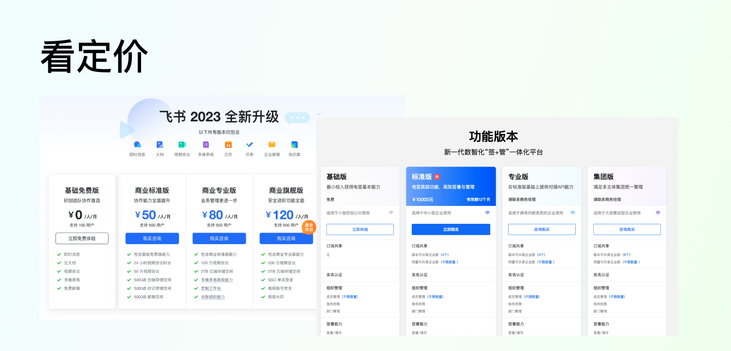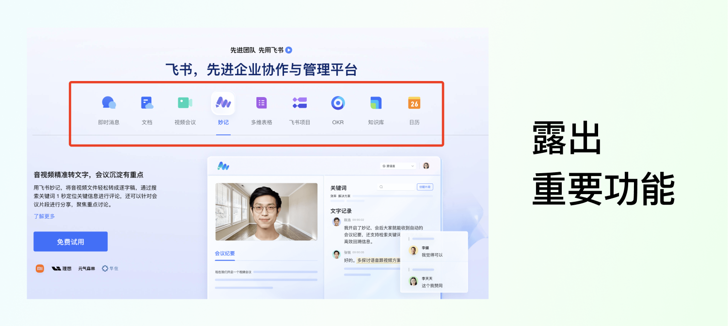 例如飛書在未登錄用戶的首頁黃金位置,把重點功能單獨強調,在登錄用戶的導航欄和頭部的位置都做了這些功能的露出。反復強調和露出,重要程度不用我多說了吧。