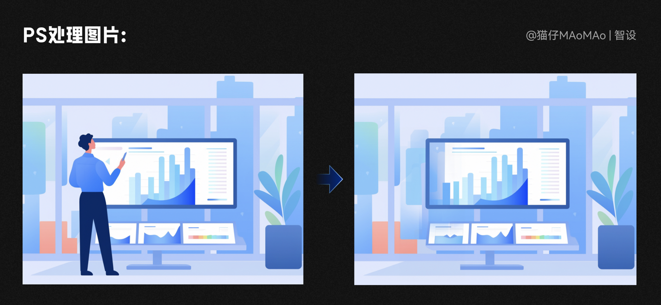生成的素材我們需要先用 PS 處理一下,背景素材需要處理的地方:主視覺多余的部分需要刪掉、色調(diào)處理、圖片比例修改。