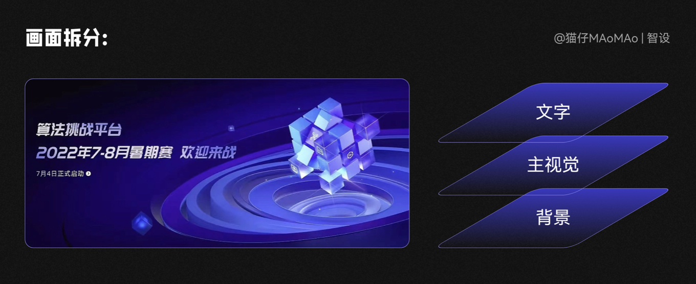 確定參考方向后,腦袋里面大致有了畫面思路,主視覺在畫面右方,螺旋狀背景突出主視覺,文字排版在左邊,整體色調(diào)為藍色+青色光感。這里我們對所選參考圖進行拆分: