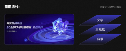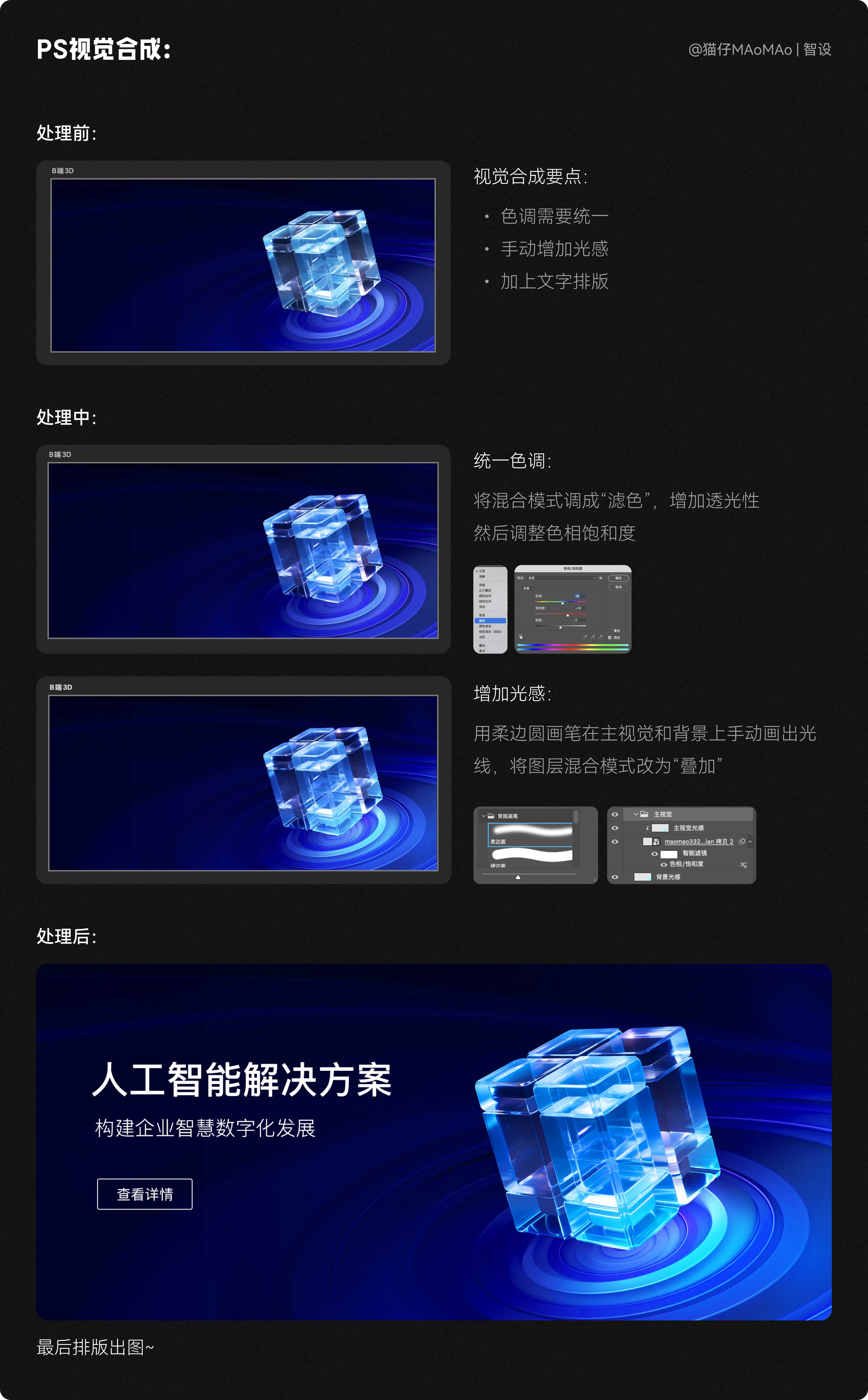 這一步考驗的是設計師的審美和手活,我們需要把背景和主視覺素材,進行視覺合成,其實也非常簡單:這里我定的主要色調(diào)是藍色+青色的光感,首先需要將色調(diào)整體統(tǒng)一;然后想要表現(xiàn)出玻璃質(zhì)感的通透,我們需要加上一些光感;最后文字排版出圖即可~