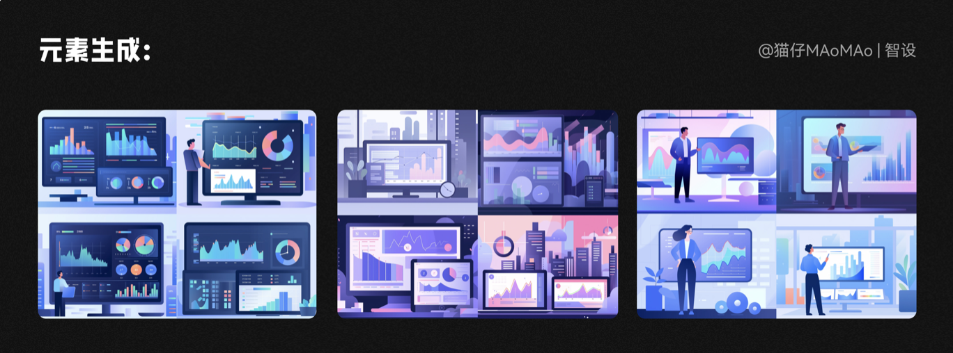 數(shù)據(jù)分析與可視化的背景,直接生成數(shù)據(jù)圖表的效果并不是很理想,把辦公室場景全部描繪出來生成的素材更加符合需求,但是還需要再手動對素材進行細化。