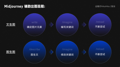 文生圖:顧名思義,需要自己腦暴出關鍵詞出圖,再通過修改關鍵詞,不斷踐行嘗試出圖。圖生圖:在有參考圖的情況下,用 /describe 圖生文命令,讓系統(tǒng)直接生成關鍵詞,再通過修改關鍵詞,不斷進行嘗試;我們先使用這種方式生成背景素材。