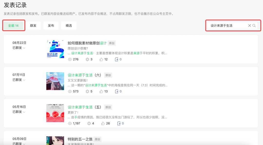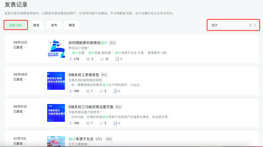 例如在微信公眾號(hào)發(fā)表記錄中的搜索,當(dāng)只輸入“設(shè)計(jì)”關(guān)鍵詞時(shí),搜索結(jié)果一共有202條,需要在這202條數(shù)據(jù)中找到自己的目標(biāo)值是比較難的。