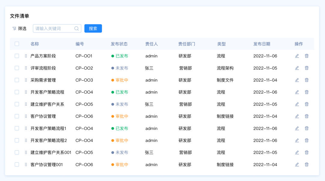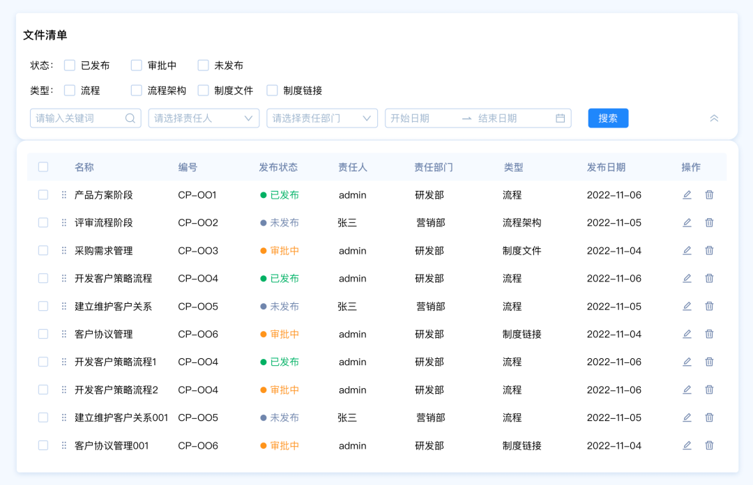 設(shè)計(jì)要點(diǎn):由于這里包含多種篩選類型,名稱和編號(hào)是關(guān)鍵詞篩選,發(fā)布狀態(tài)和、責(zé)任人、責(zé)任部門、類型是選項(xiàng)篩選,發(fā)布日期是時(shí)間區(qū)間篩選。所以我們需要采用組合篩選的模式。