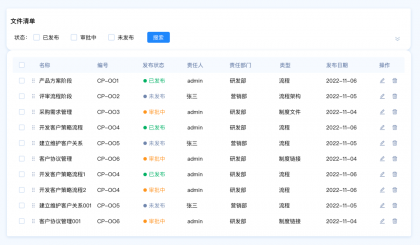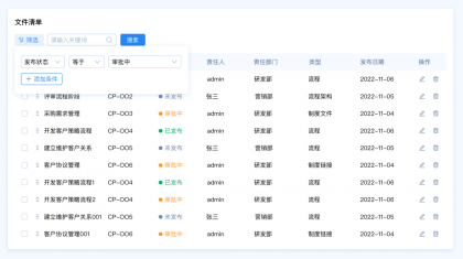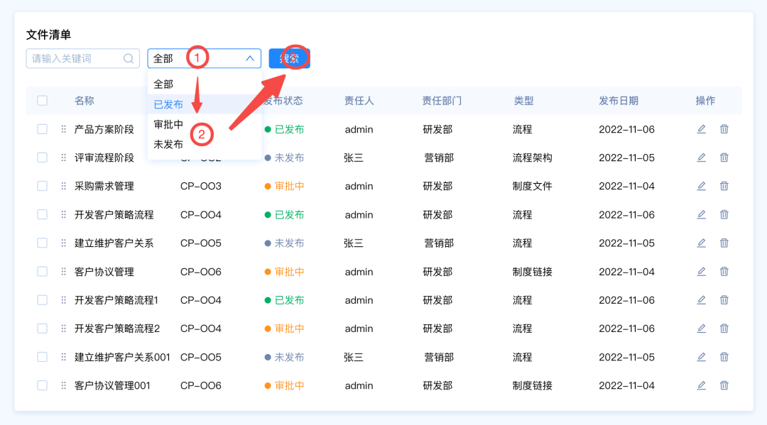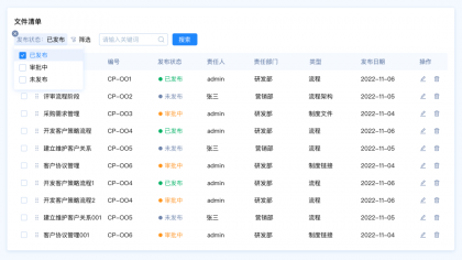 需求背景:客戶A想要快速篩選文件清單中發(fā)布狀態(tài)為“審批中”的數(shù)據(jù),希望能夠直接看到文件的狀態(tài)類型,快速選擇類型。
