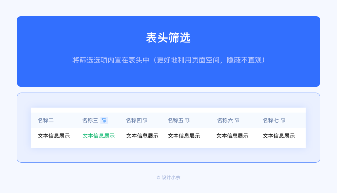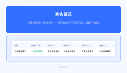 將篩選選項(xiàng)內(nèi)置在表頭中(更好地利用頁面空間,隱蔽不直觀)。當(dāng)頁面空間有限時(shí),可以考慮此方案。另外當(dāng)表格表頭字段數(shù)據(jù)較多時(shí),需要橫向滑動(dòng)查看數(shù)據(jù)時(shí),建議還是直接將篩選條件單獨(dú)放在外面?;蛘弋?dāng)需要篩選的選項(xiàng)太多時(shí),表頭字段都能篩選時(shí),也可以考慮放在表頭中。