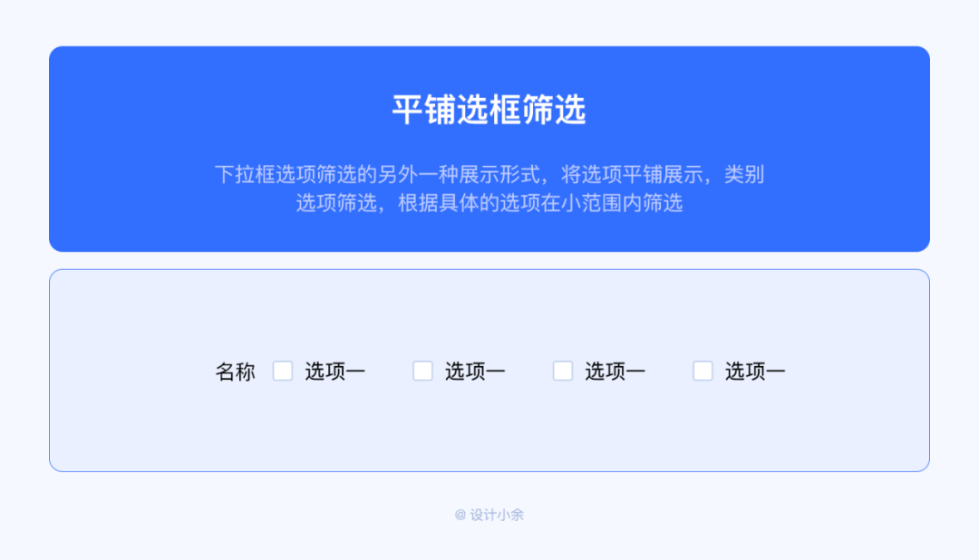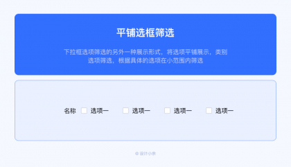 下拉框選項(xiàng)篩選的另外一種展示形式,將選項(xiàng)平鋪展示,類別選項(xiàng)篩選,根據(jù)具體的選項(xiàng)在小范圍內(nèi)篩選。