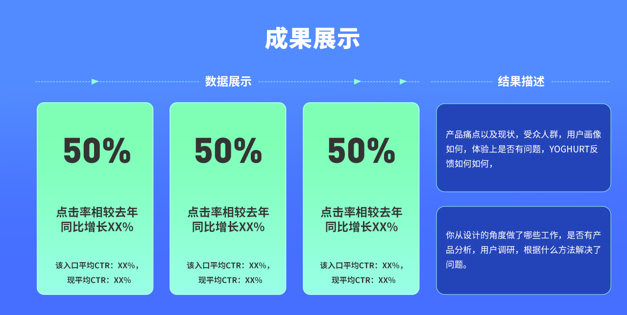 比如有同學會說,“本年度共計輸出xx張圖,完成xx個項目,”,還是那句話,這些都是作為設計師常規產出,對于領導以及評委來說,更關注你是否為團隊做了貢獻,比如協同產研運制定設計規范,設計模板,提升各方工作效率,通過設定產研運sop流程大大提高了溝通效率,節省設計,產品,運營資源等。這些才是評委們更想看到的。畢竟做了多少張圖,沒有任何結果證明的圖是否有效,有的人一萬張圖結果不變,有的人十張圖就可以讓項目整體入口數據提升xx%,這才是有效設計。