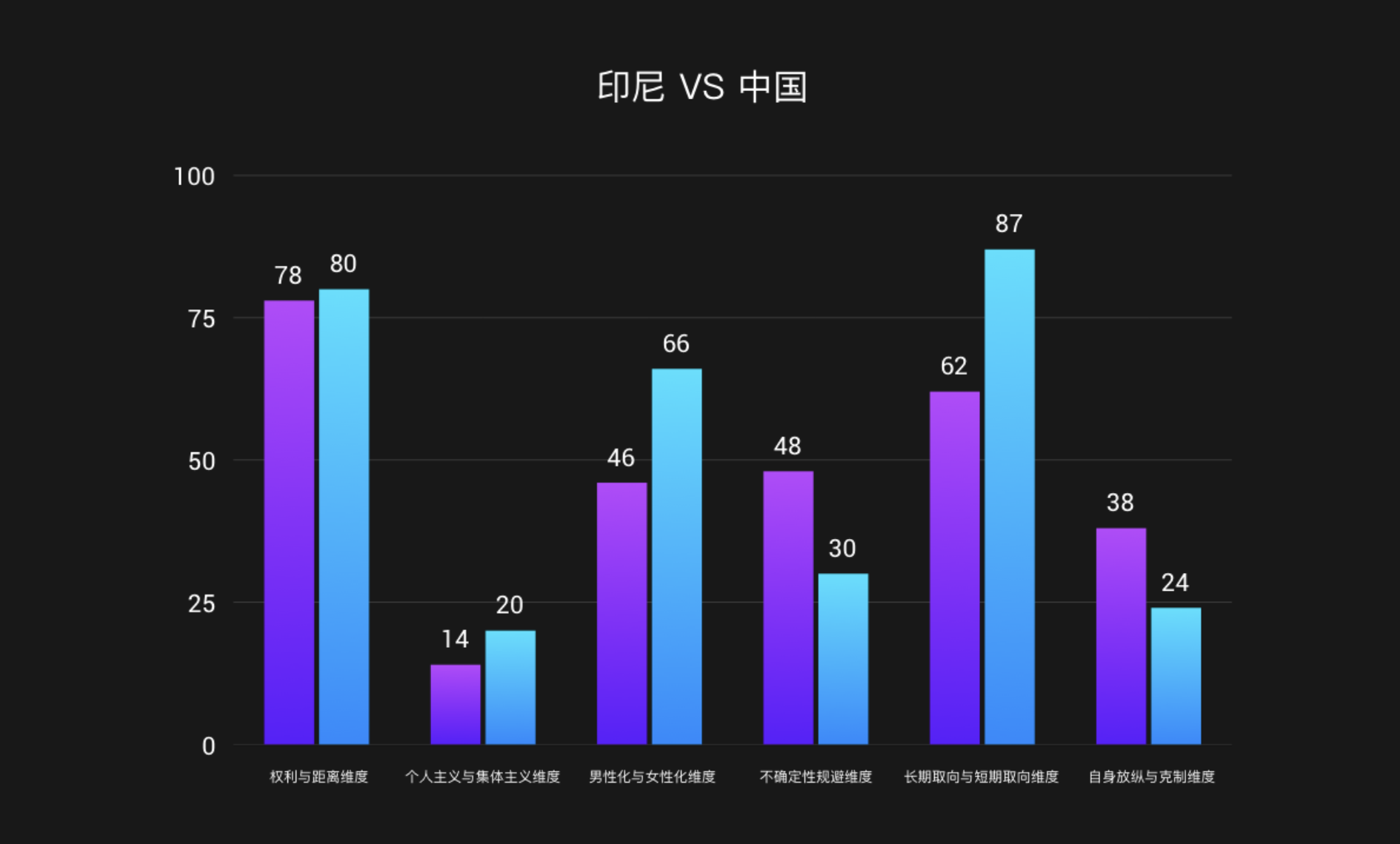 在設計前期,我們需要先對目標用戶的文化差異進行分析,解讀出印尼文化和中國文化的差異與共性。下面引用 hofstede 的六個文化維度理論去構建文化場景。
