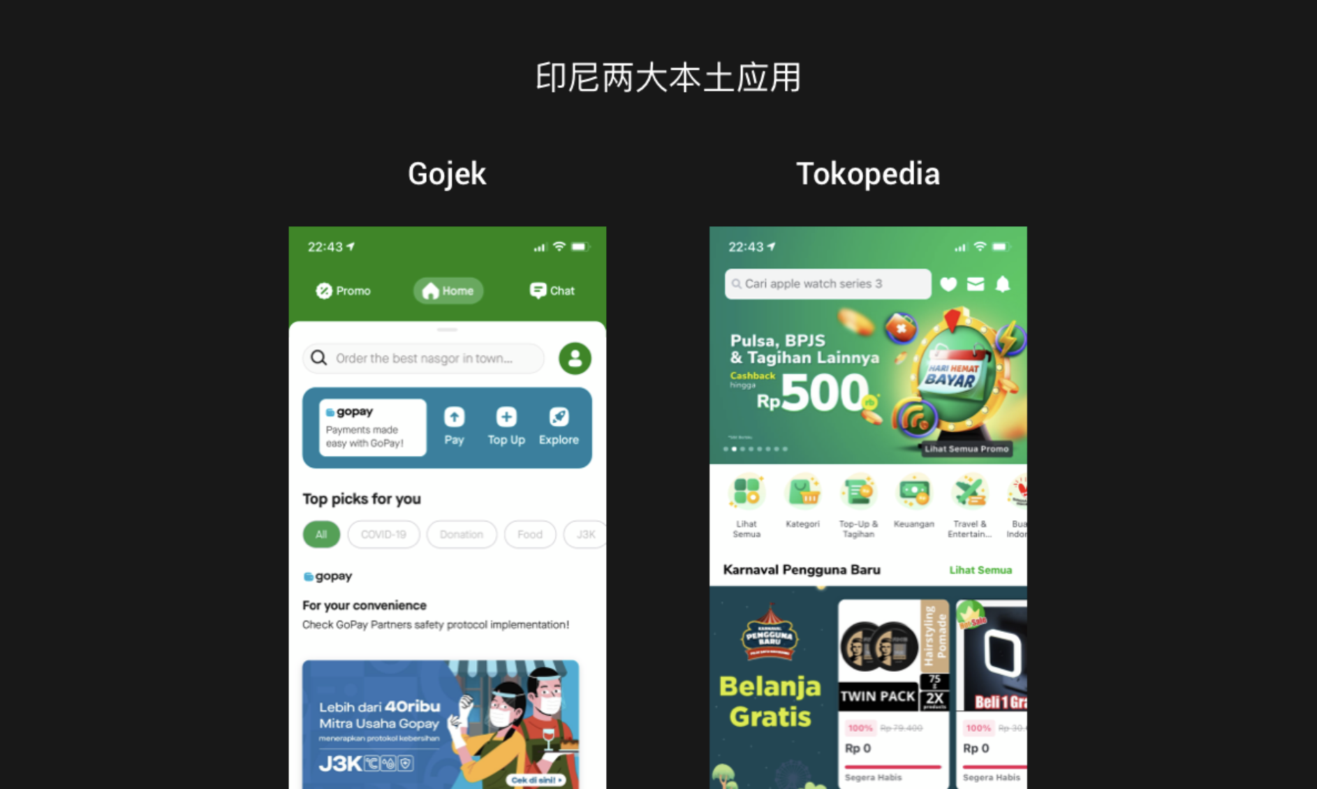 由于是穆斯林國家,綠色深受當地人喜愛。在伊斯蘭教中,綠色象征著生命與自然。除了綠色,白色和藍色也是當地人民所喜愛的顏色。在選擇自己產品的主色調時,不妨參考這幾種顏色。下圖是印尼的兩大本土應用,Gojek 是當地的一個超級 APP,提供出行、物流、食品、購物、支付等一站式服務,可以理解為是滴滴、美團、餓了么、支付寶、順豐等這些公司產品服務的集合,Tokopedia 是當地的電商平臺。兩家都選擇了綠色為主色調,這是因為創始人有虔誠的信仰,在伊斯蘭教中,綠色通常被認為是伊斯蘭教的象征。
