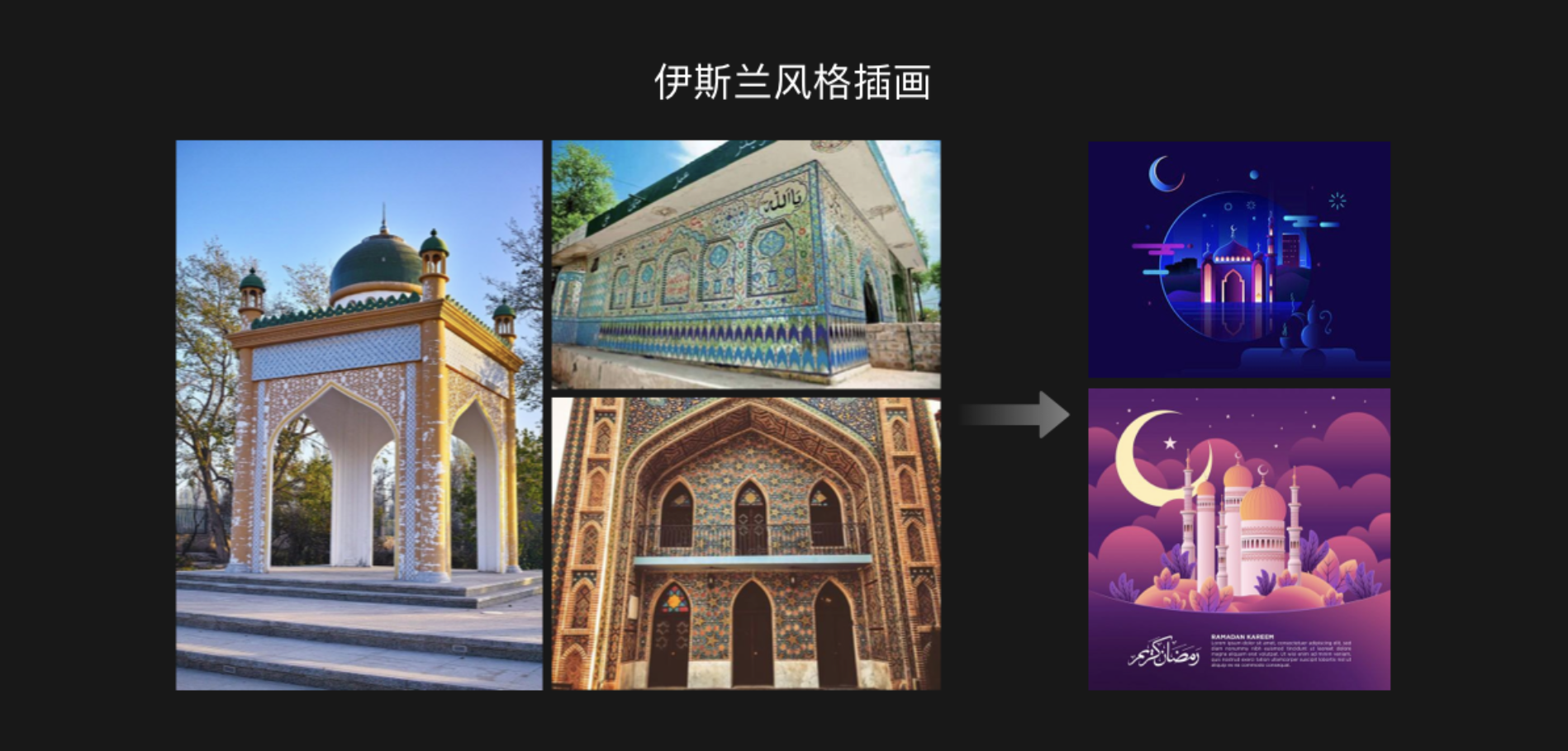 如果是想要創作較強的宗教色彩的風格插畫,可以嘗試融入伊斯蘭文化的藝術。如下圖中插畫中,在造型上就提煉了穹頂、拱門、尖塔的形狀。伊斯蘭藝術中主要的裝飾物是幾何紋理、植物紋理和文字紋理,紋理之間均衡、對稱、有節奏感。在色彩上也可以使用藍綠色,藍綠色在伊斯蘭藝術中占有重要地位。裝飾紋理再加上藍綠色,形成了獨特的伊斯蘭教風格藝術。