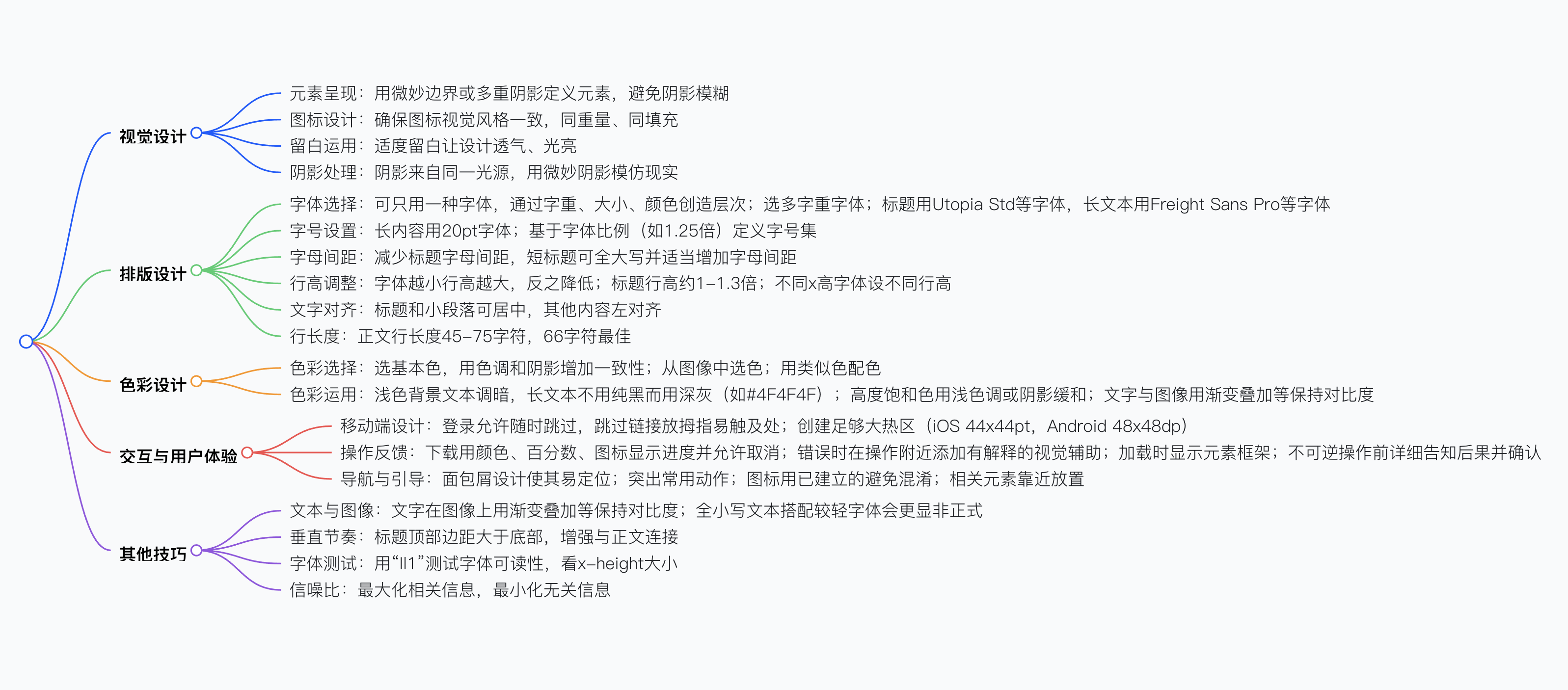 收集了 多個 UI 和 UX 設計小技巧,涵蓋視覺設計、排版、色彩、交互等多方面,包括通過微妙邊界或多重陰影讓元素更清晰、減少標題字母間距以實現視覺平衡、確保圖標風格一致、適當留白使設計更透氣、20pt 字體提升長文本閱讀體驗、基于字體比例定義字號集、選擇基本色并通過色調和陰影增加一致性、移動端登錄允許用戶隨時跳過并將跳過鏈接放在拇指易觸及位置、確保陰影來自同一光源、合理進行圖層管理、通過色彩對比度等突出重要元素、錯誤時添加視覺輔助、移動端創建足夠大熱區、保持文字與圖像對比度等,這些技巧能通過最小調整改善設計細節和用戶體驗。