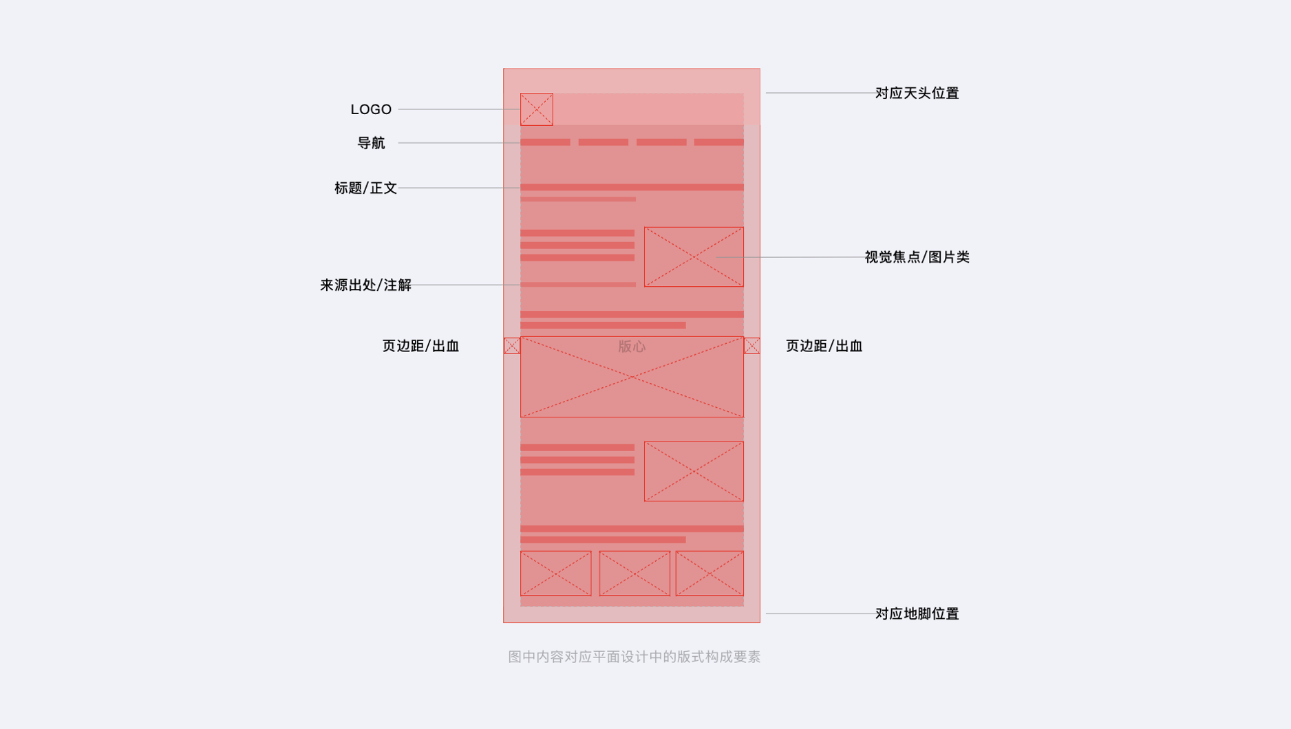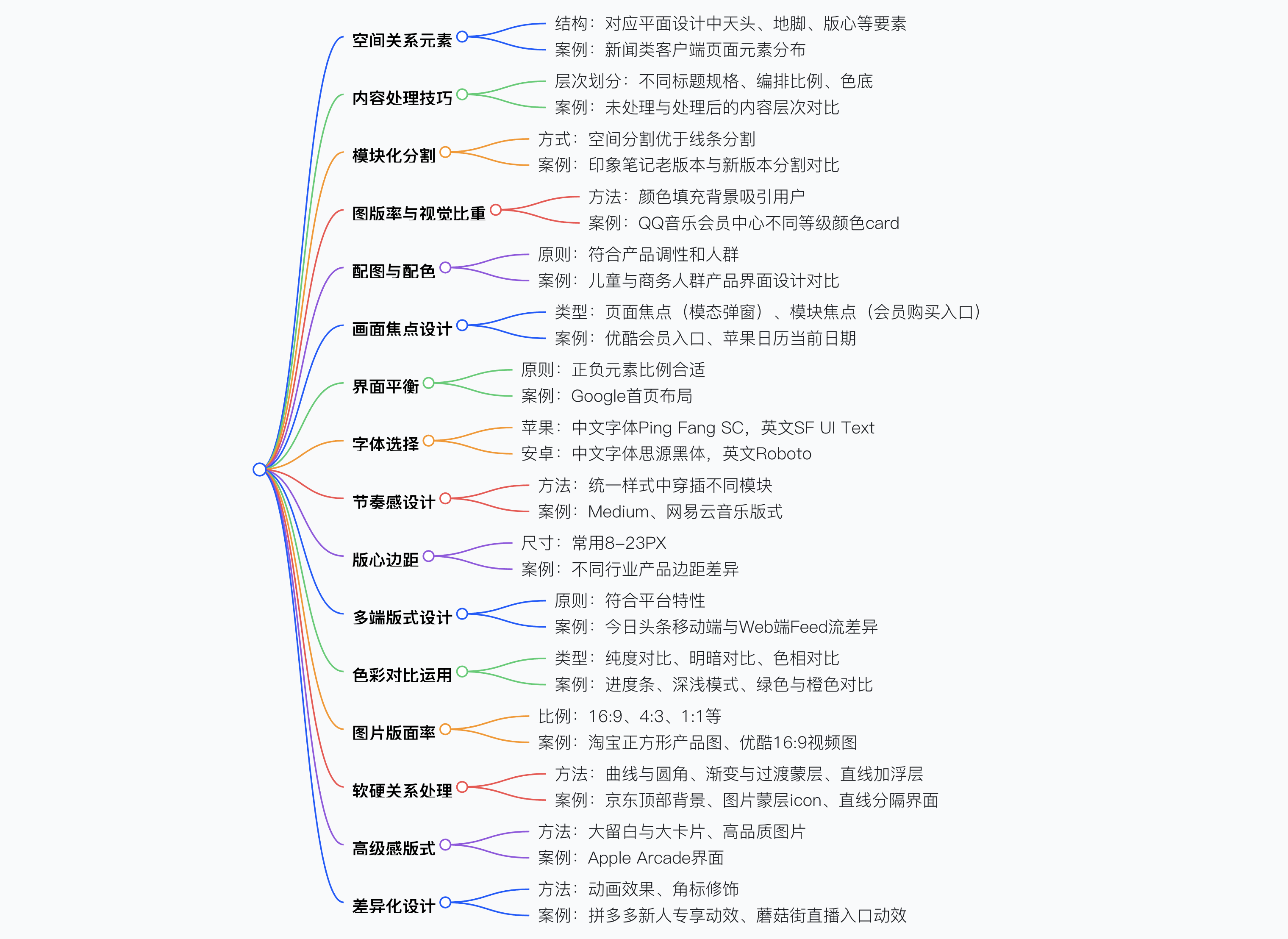 - 空間關系元素:運用平面設計中的天頭(LOGO、導航)、版心(標題 / 正文、視覺焦點)、地腳(來源出處)等結構思考 UI 界面布局,如新聞類客戶端頁面元素對應分布。