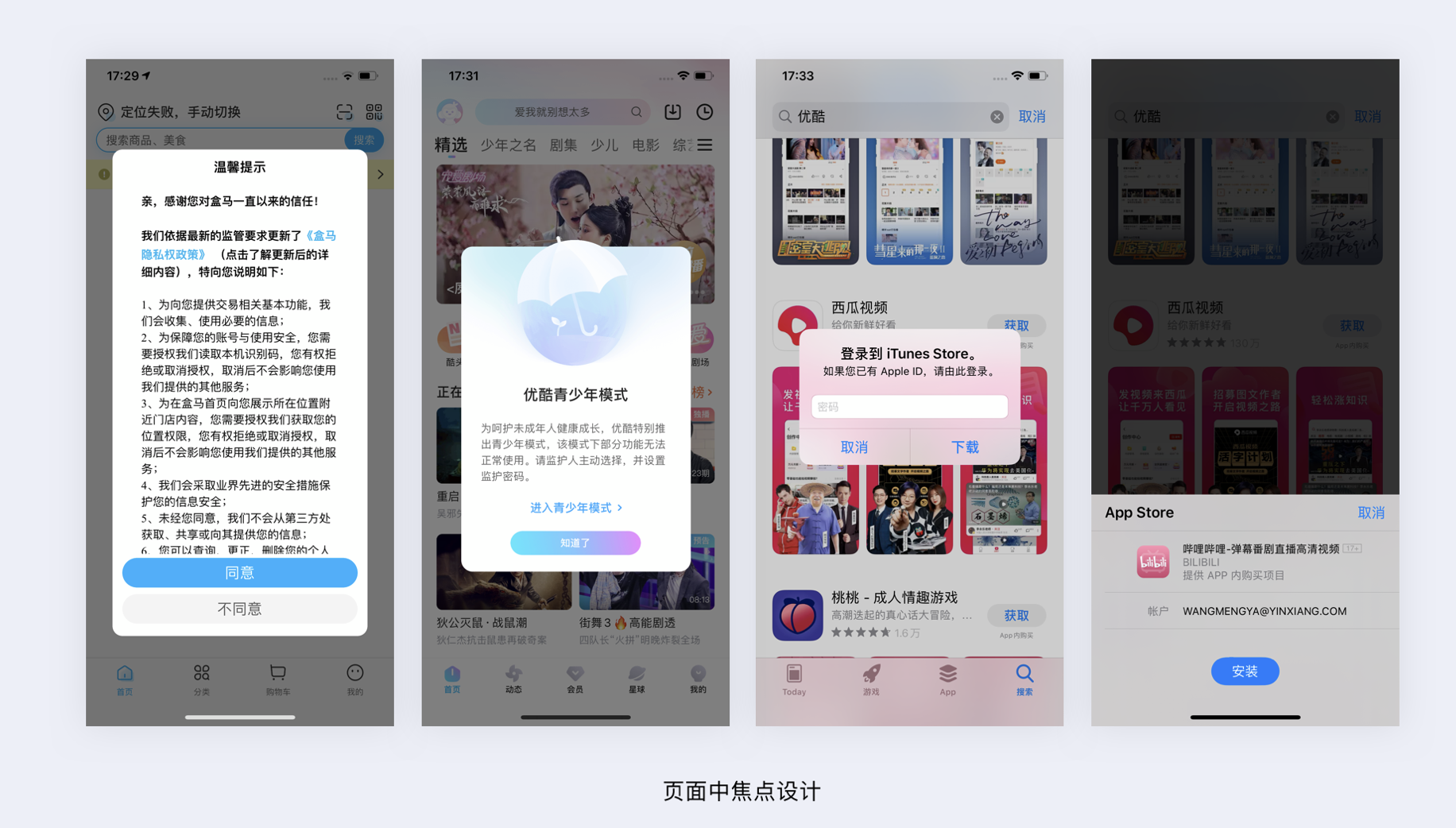 - 頁面焦點:采用模態彈窗等不可忽視的方式,如盒馬隱私政策彈窗。