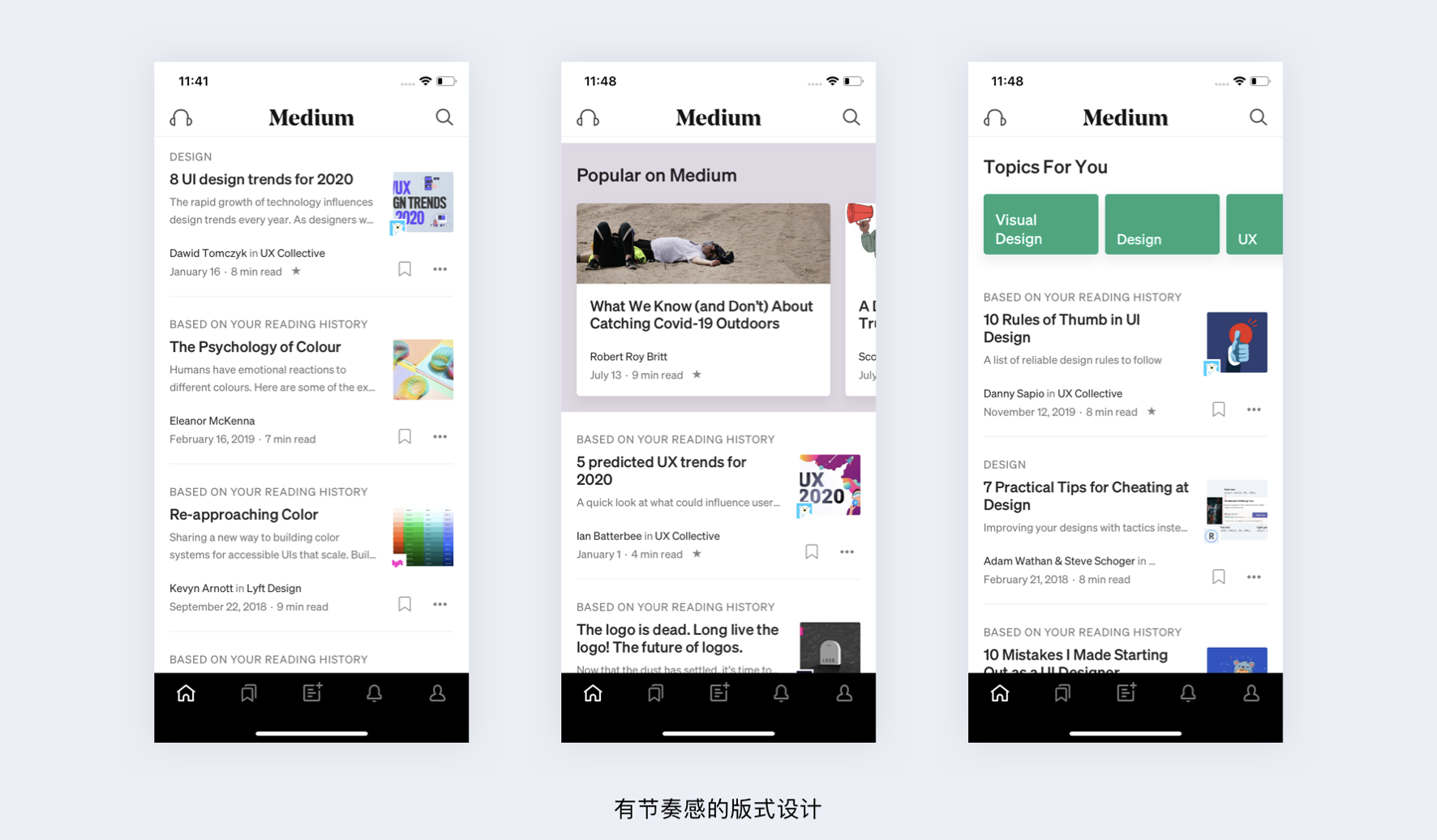 - 節奏感設計:在統一樣式中穿插不同模塊,如 Medium、網易云音樂的版式設計。