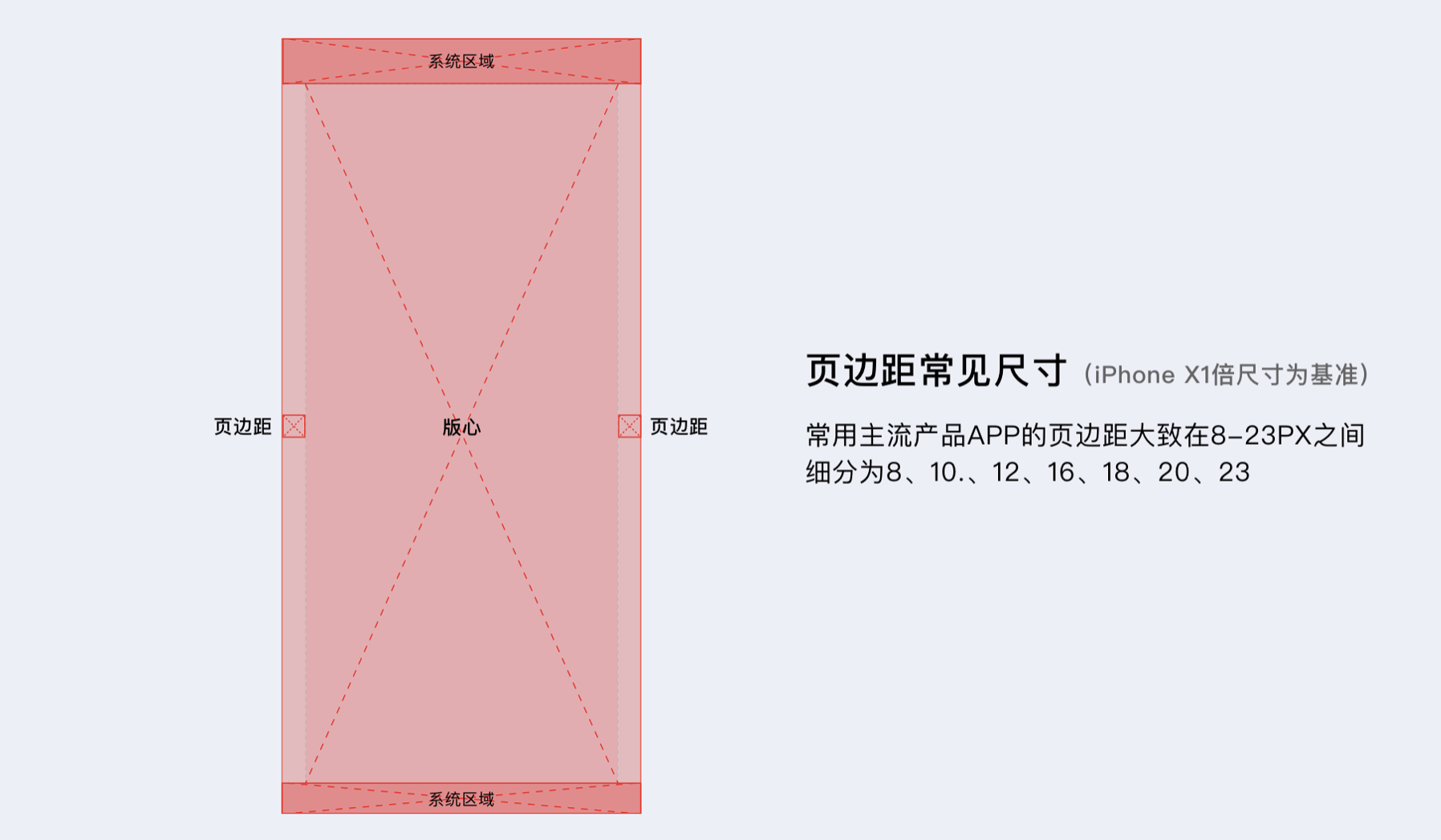 - 版心邊距:常用尺寸 8-23PX(以 iPhone X1 倍尺寸為基準),內容多的文字類和購物類產品邊距較小,圖片、視頻類產品邊距較大。