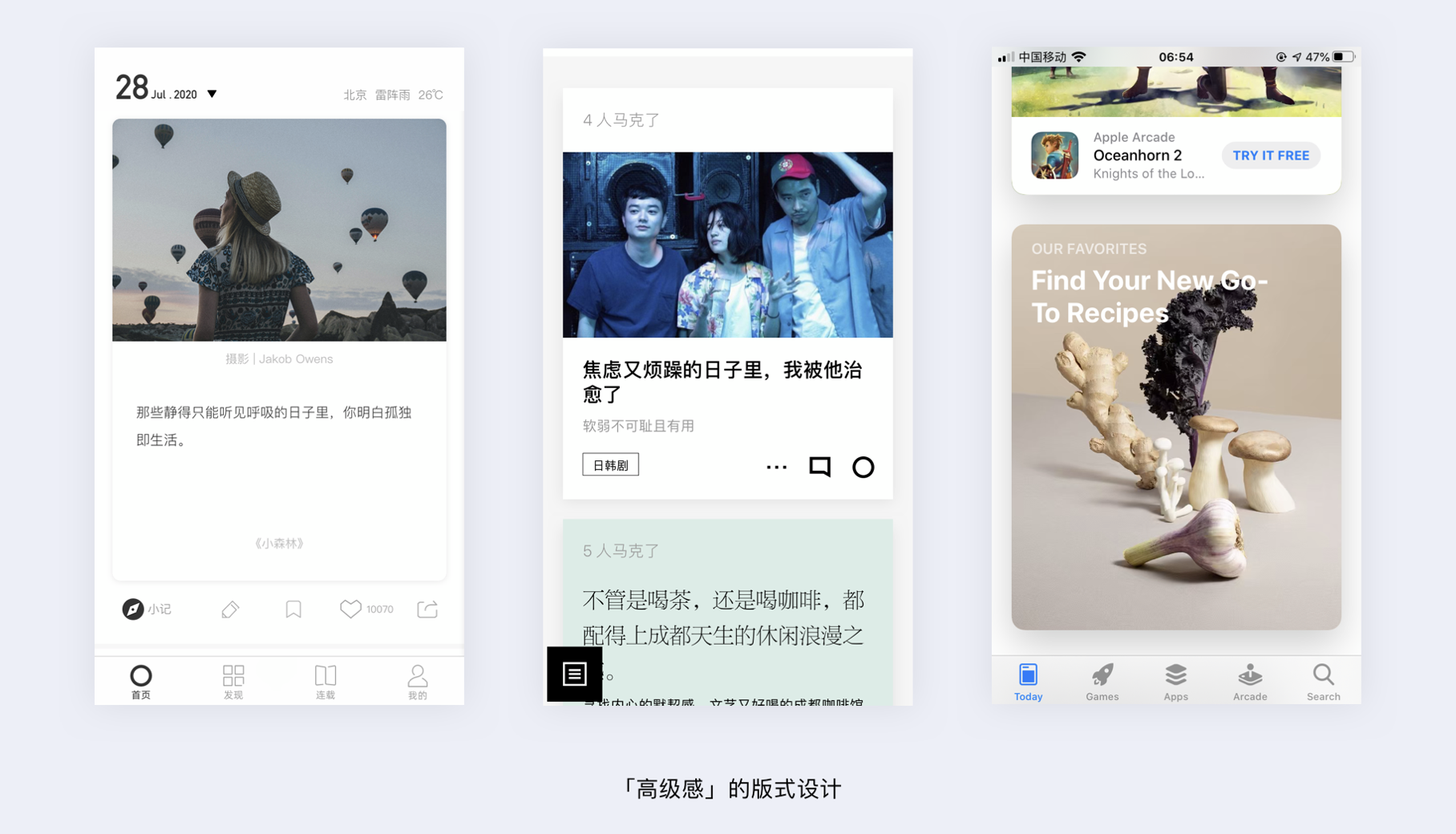 - 高級感版式:利用大留白、大卡片、高品質圖片,如 Apple Arcade 界面。