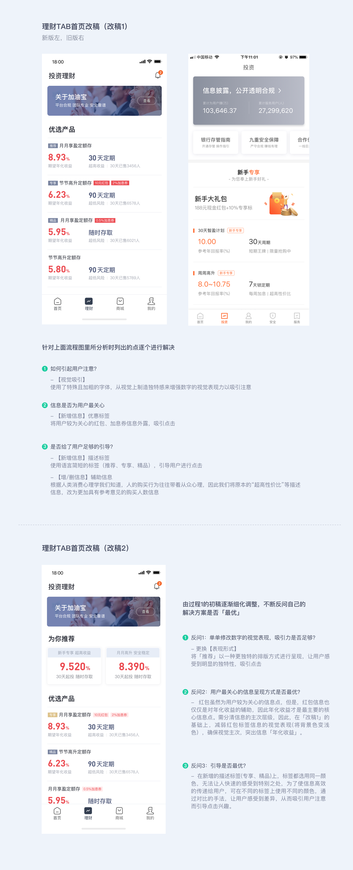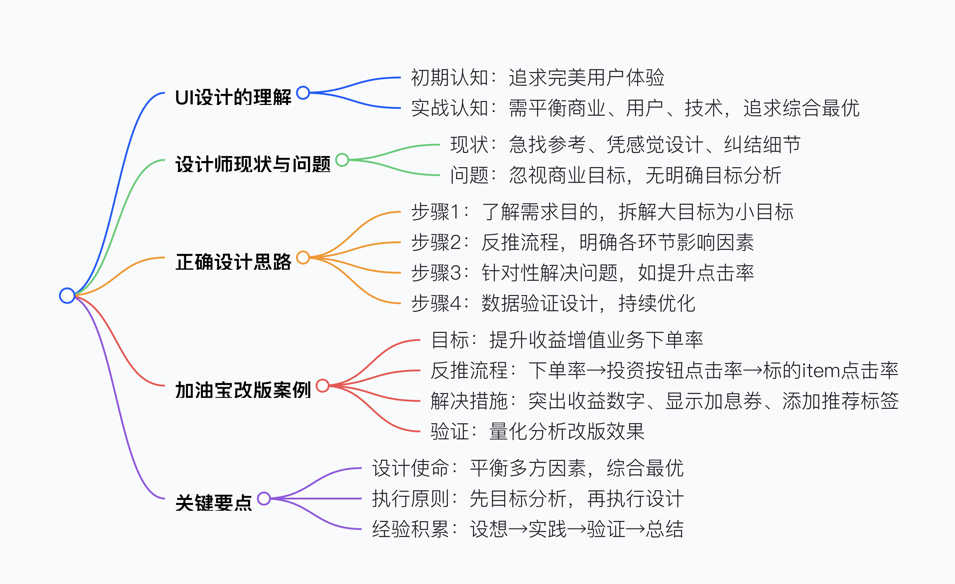 UI 設計的終極目標并非單純追求極致用戶體驗,而是在「商業」「用戶」「技術」等多方面條件限制下取得平衡,得出「綜合最優」的解決方案。設計師常陷入拿到需求就找參考、憑感覺設計、在細節糾結的誤區,正確做法是先明確需求背后的商業目標,將大目標拆解為小目標,如加油寶 APP6.0 改版時為提升 “收益增值業務下單率”,反推需提升標的 item 點擊率、“立即投資” 按鈕點擊率等,再針對性解決,最后通過數據驗證設計效果,如此才能積累經驗、理清思路。