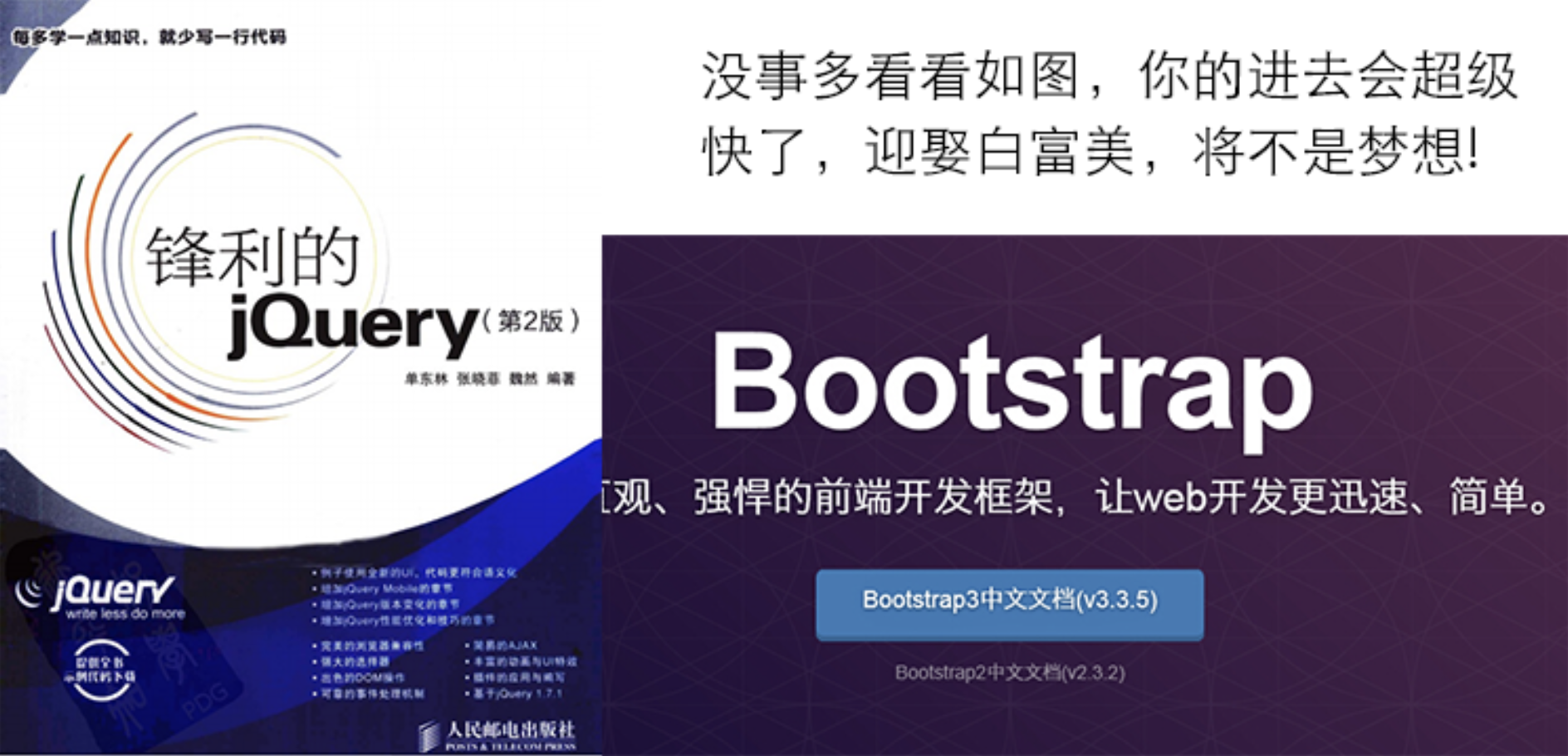 • 研究主流趨勢:要了解主流趨勢,比如懂一些 HTML5 相關知識。若不懂代碼,當程序員表示設計無法實現時,可能導致辛苦設計的內容和思路需要重新改版。多學習相關知識,如了解《鋒利的 jQuery (第 2 版)》、Bootstrap 等前端開發框架相關內容,有助于提升設計的 “高大上” 程度,避免默默聽從他人不合理的指揮。