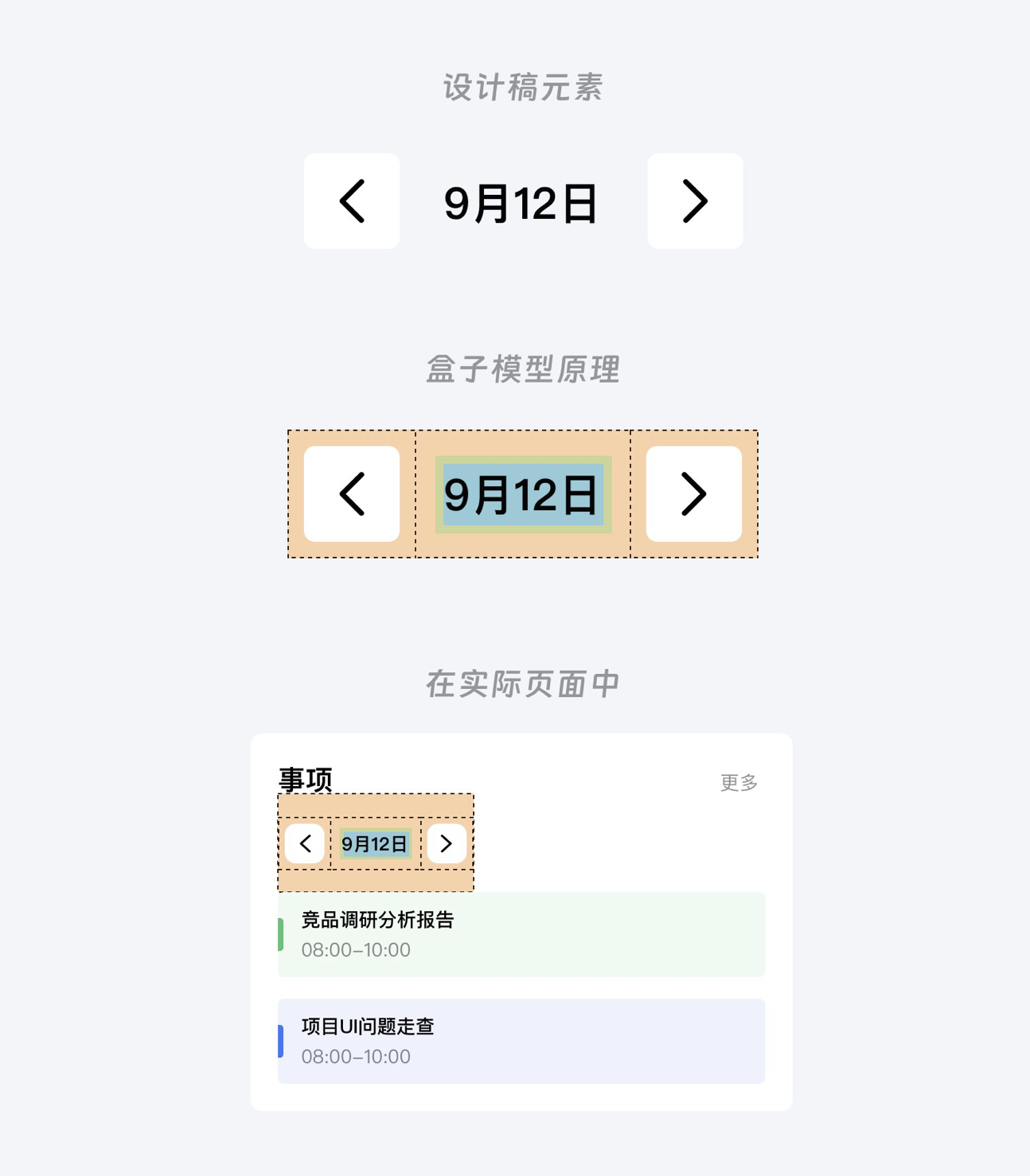 • 案例實操:以 “9 月 12 日” 的日程元素為例,其內容(如事項名稱、時間)對應 content,內容與邊框的距離為 padding,元素邊框為 border,與其他元素的間距為 margin。通過調整這些屬性,可讓元素按設計稿布局整齊排列。