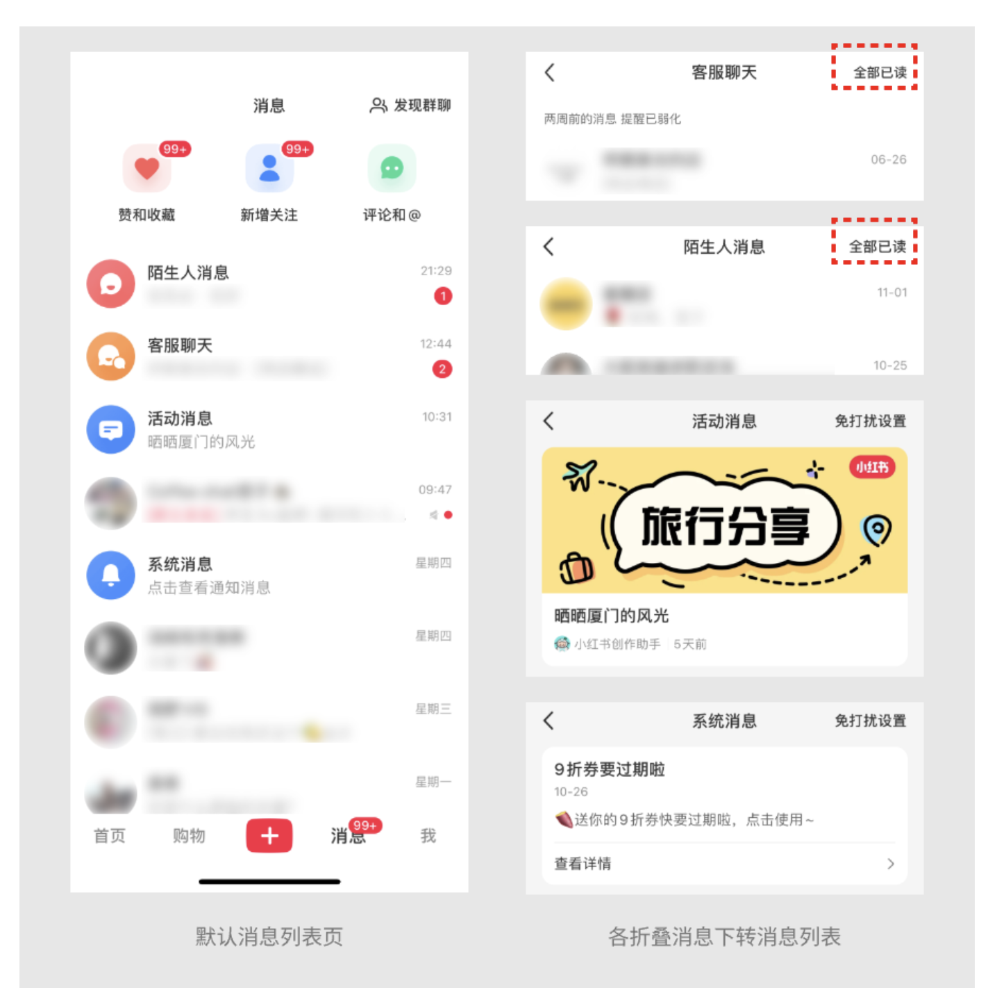 像微信、釘釘、小紅書的核心消息(贊、評論、私信),幾乎都沒有 “一鍵已讀”。因為這些消息里藏著 “關鍵社交信號”:微信的工作消息漏看可能耽誤事,小紅書的評論里可能有粉絲的提問,釘釘的協同通知關系到項目進度。如果加了 “一鍵已讀”,用戶很可能誤清重要內容,反而影響體驗。