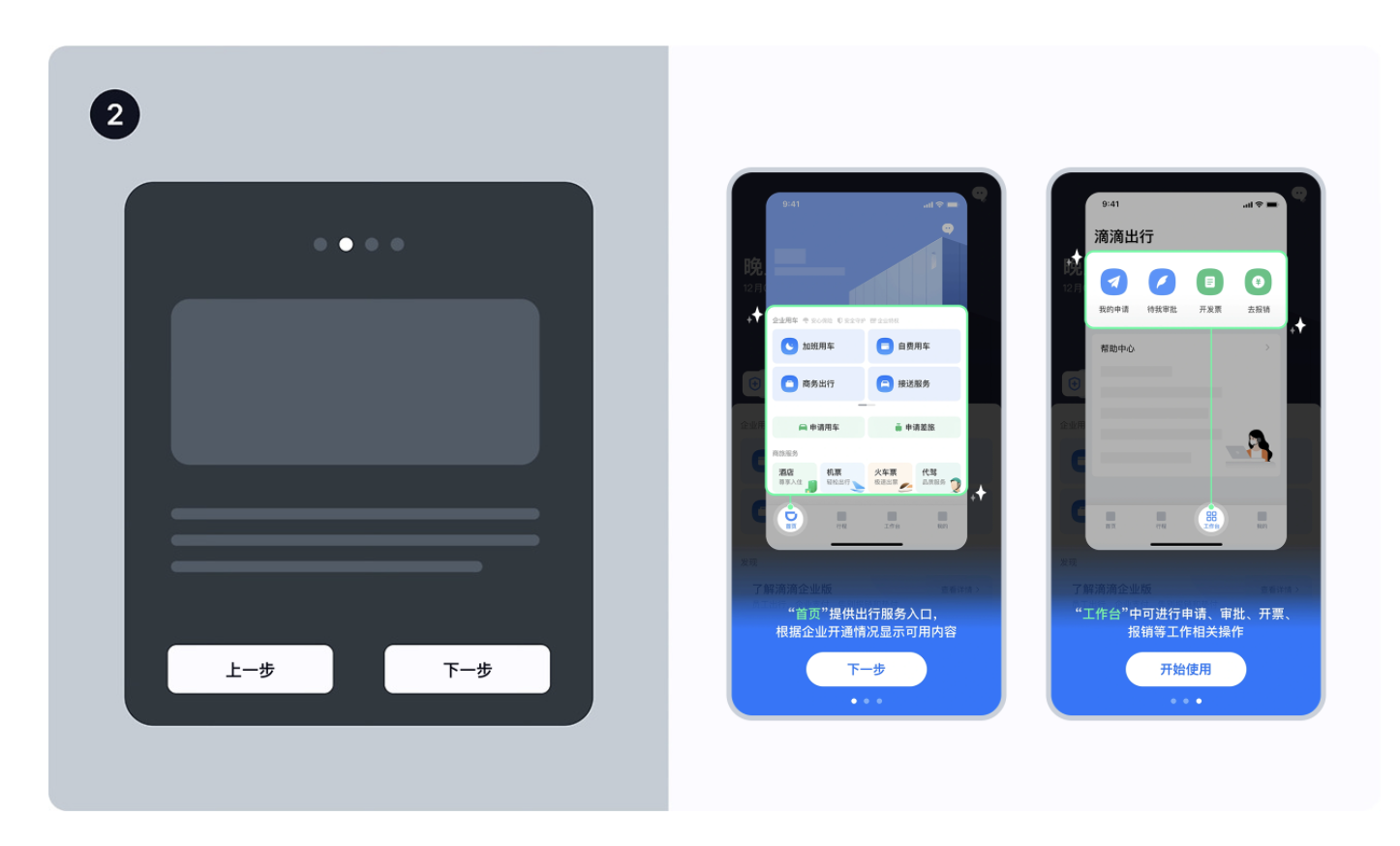 • 例子:滴滴企業(yè)版的新手引導,先講 “首頁有出行服務(wù)入口”,再講 “工作臺能審批、開票”,每步只傳遞一個信息,用戶不會覺得混亂;